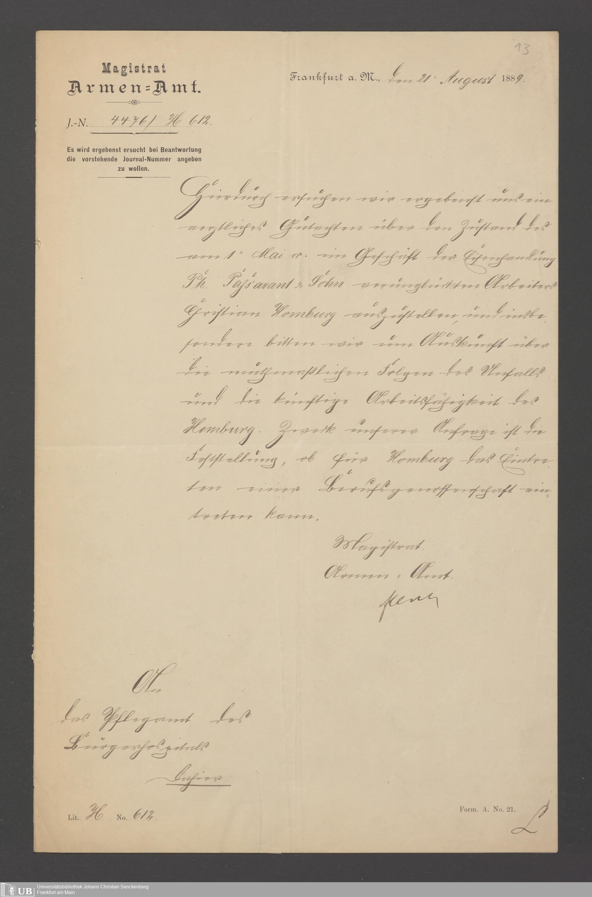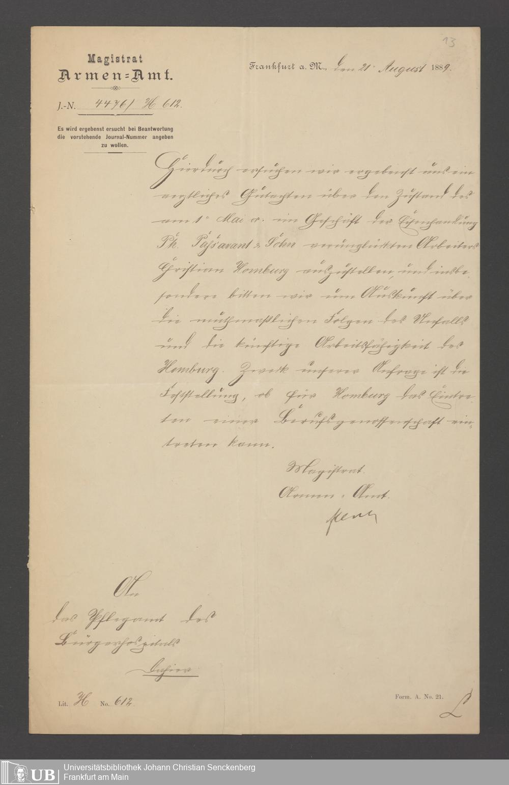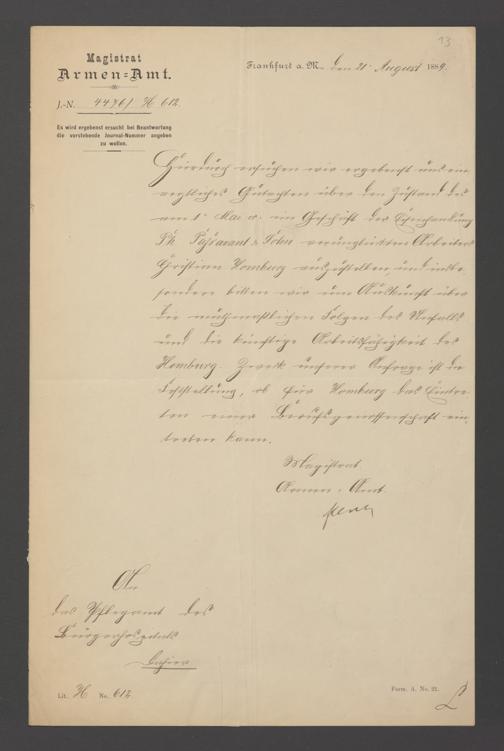 B 5 Dr. Senckenbergische Stiftung, 22 - Schriftwechsel zwischen der Verwaltung des Bürgerhospitals und dem Armenamt der Stadt Frankfurt
