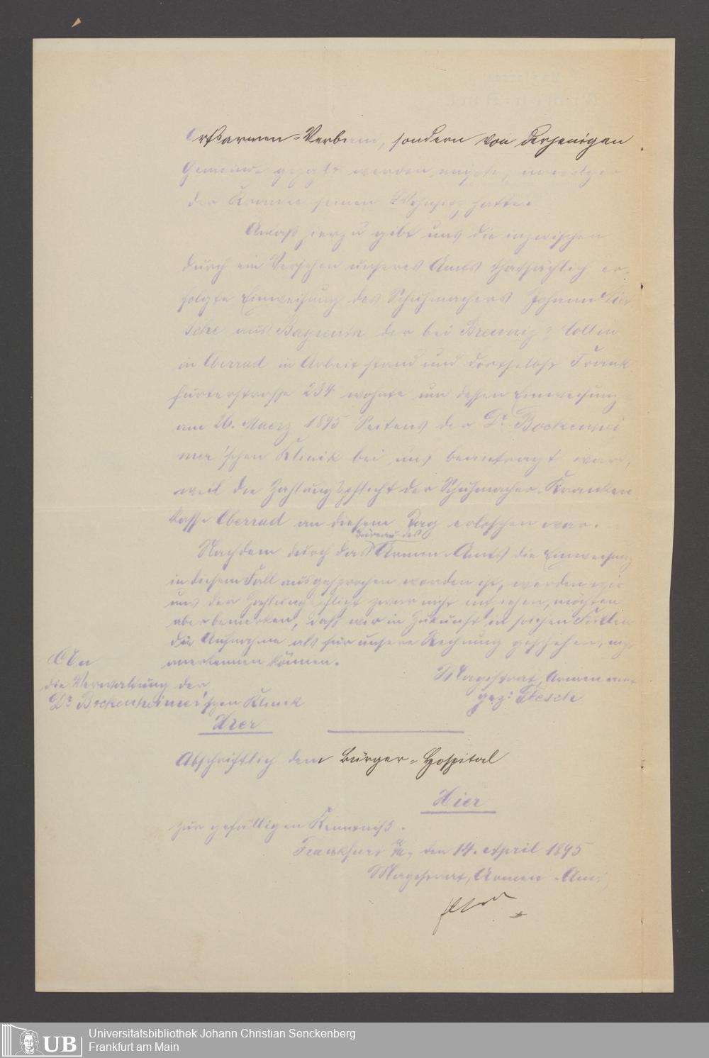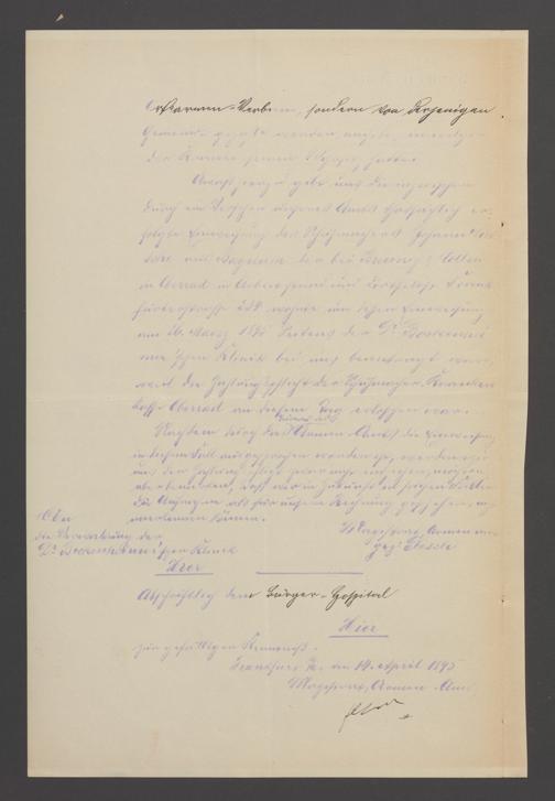B 5 Dr. Senckenbergische Stiftung, 22 - Schriftwechsel zwischen der Verwaltung des Bürgerhospitals und dem Armenamt der Stadt Frankfurt