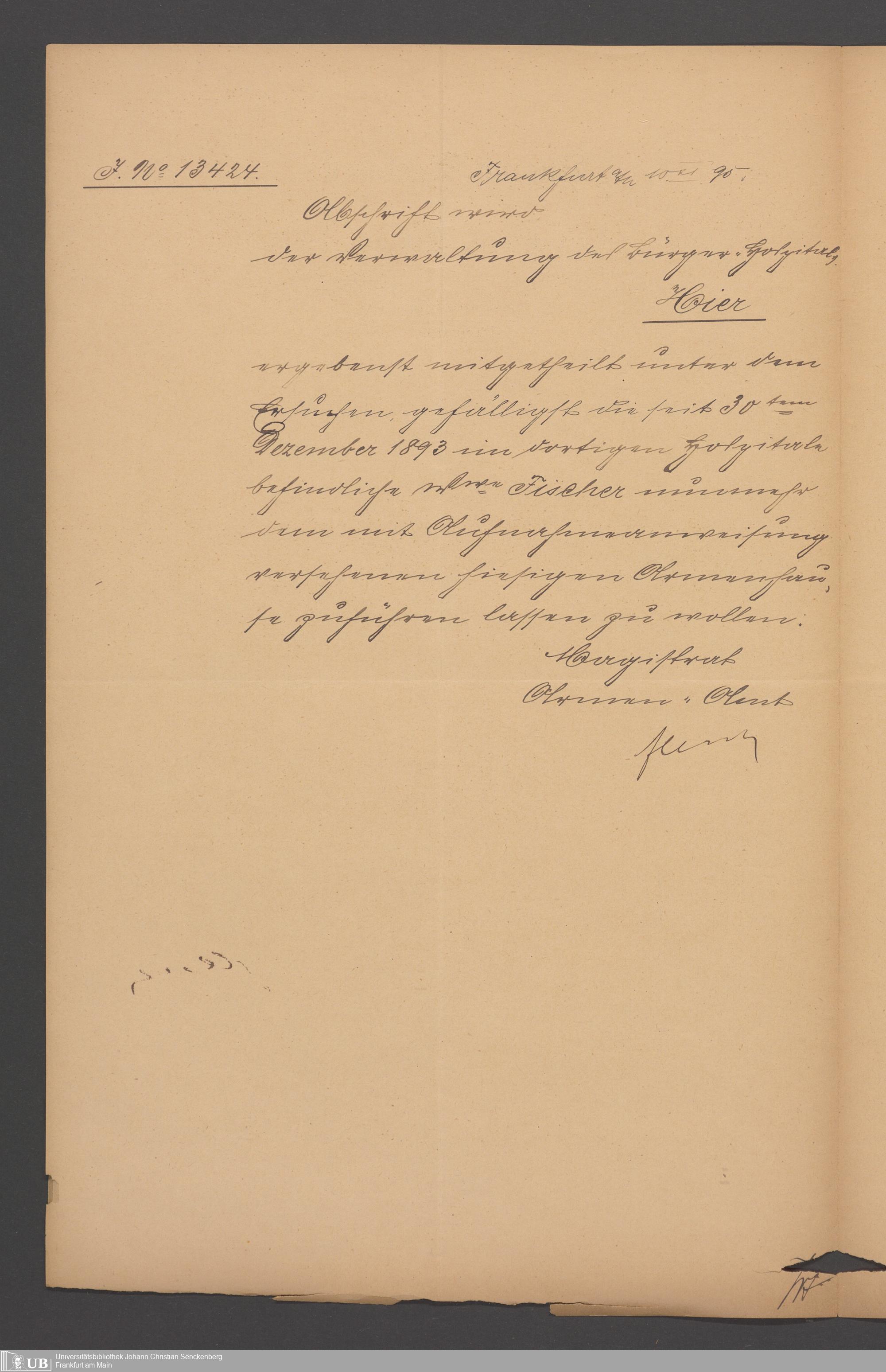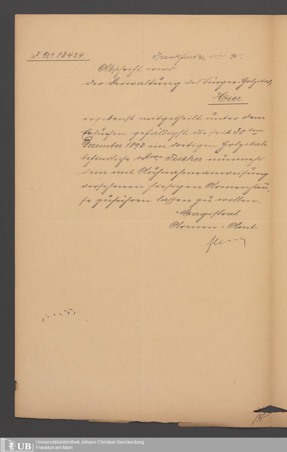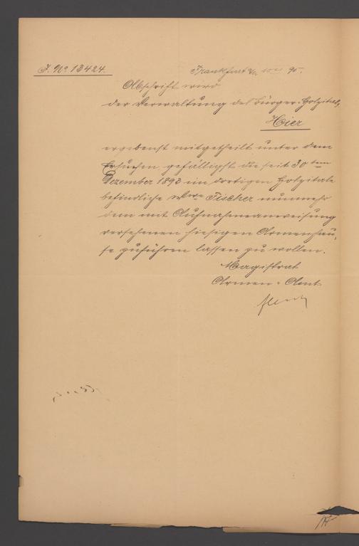 B 5 Dr. Senckenbergische Stiftung, 22 - Schriftwechsel zwischen der Verwaltung des Bürgerhospitals und dem Armenamt der Stadt Frankfurt