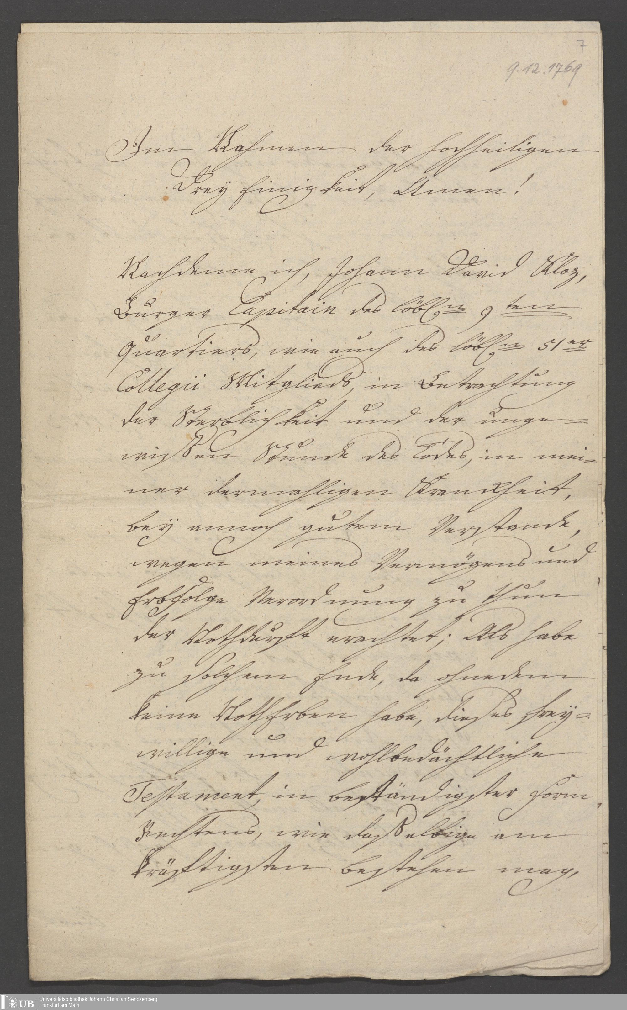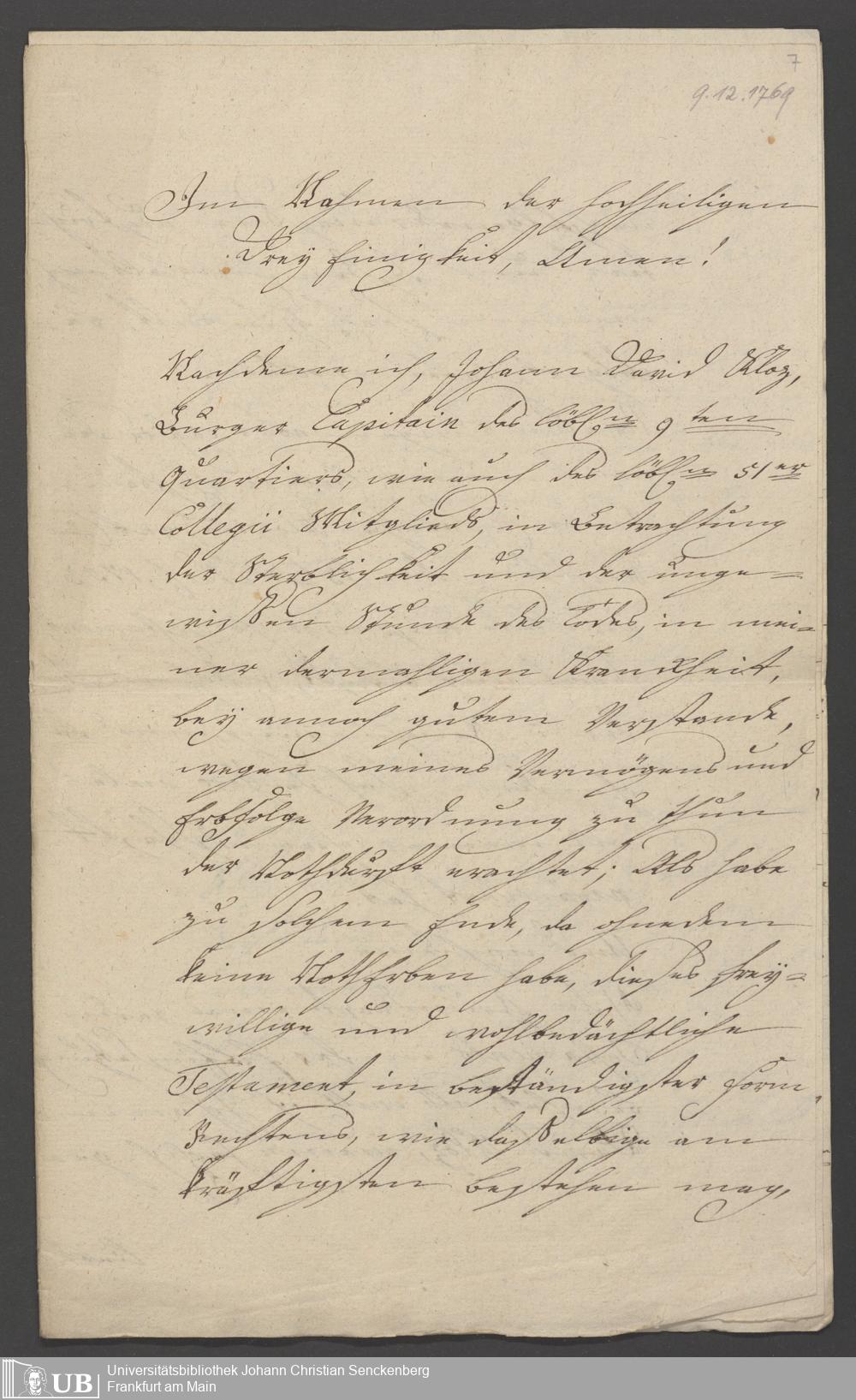 B 5 Dr. Senckenbergische Stiftung, 85 - Testament Johann David Klotz