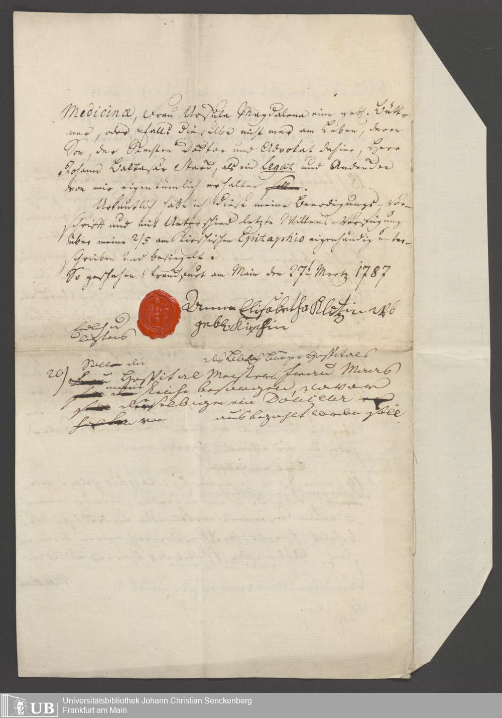 B 5 Dr. Senckenbergische Stiftung, 86 - Testament Anna Elisabeth Klotz, geb. Kirsch