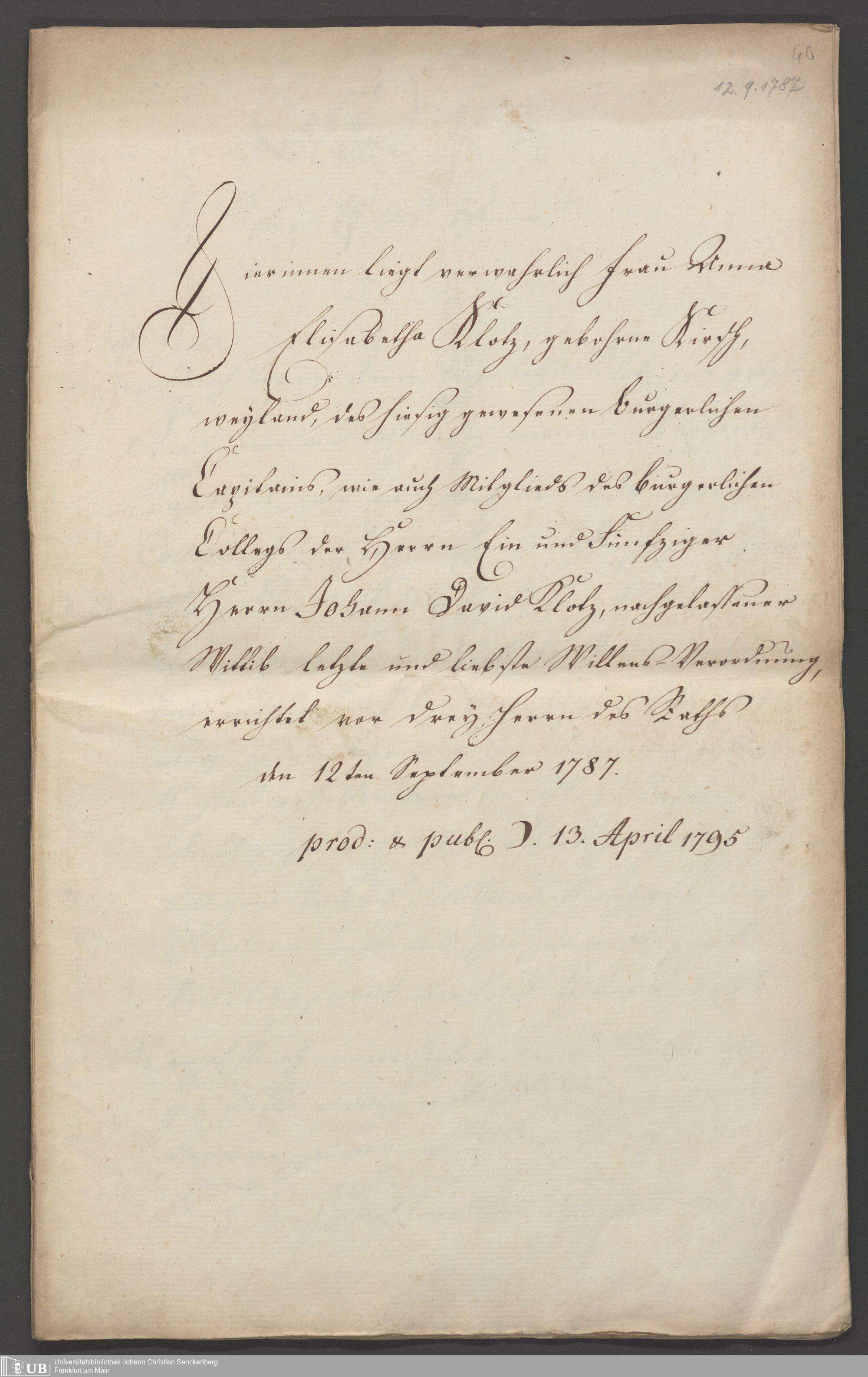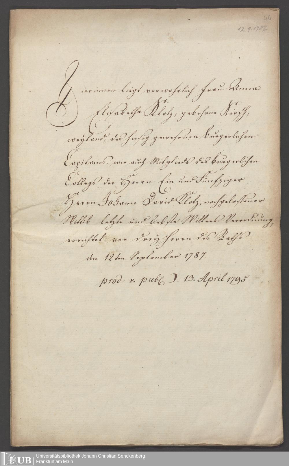 B 5 Dr. Senckenbergische Stiftung, 86 - Testament Anna Elisabeth Klotz, geb. Kirsch