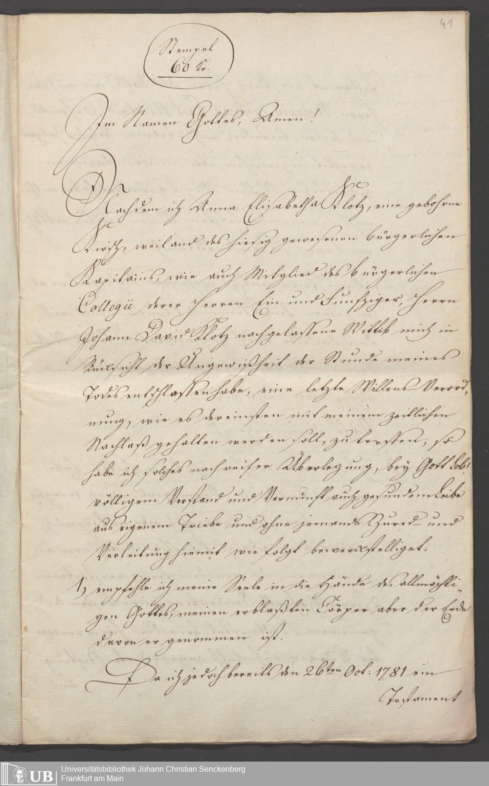 B 5 Dr. Senckenbergische Stiftung, 86 - Testament Anna Elisabeth Klotz, geb. Kirsch