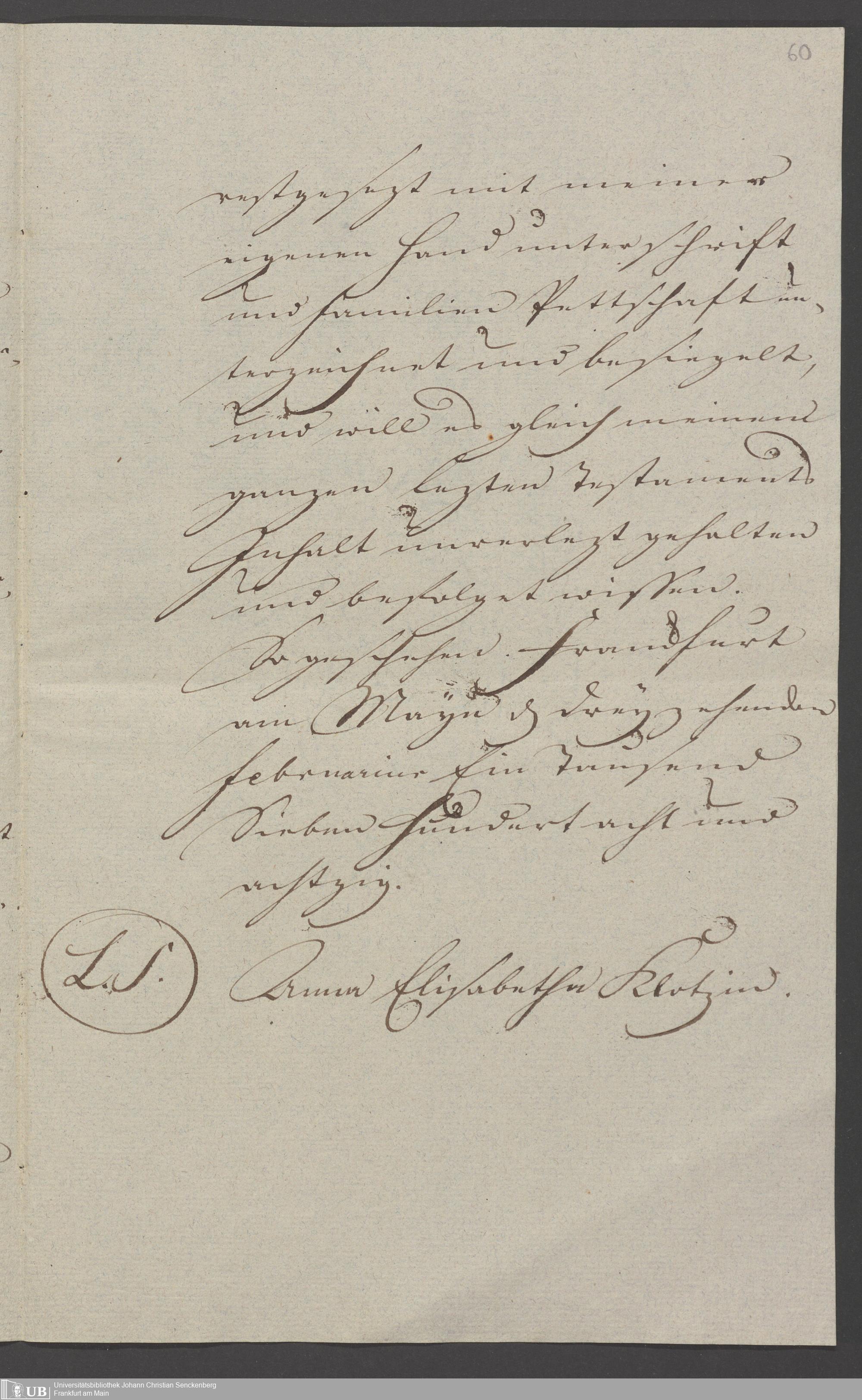 B 5 Dr. Senckenbergische Stiftung, 86 - Testament Anna Elisabeth Klotz, geb. Kirsch