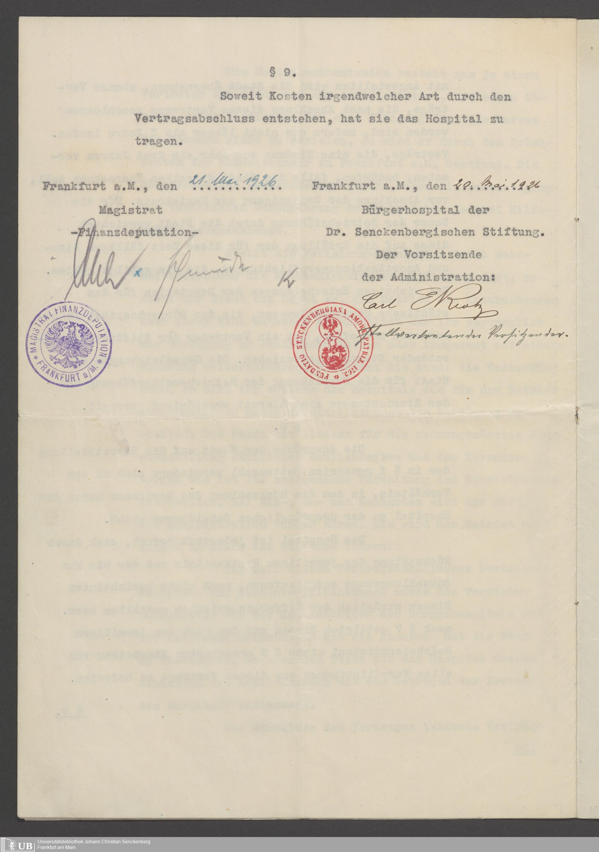 B 5 Dr. Senckenbergische Stiftung, 26 - Vertrag der Senckenbergischen Stiftung mit der Stadt Frankfurt über das Bürgerhospital