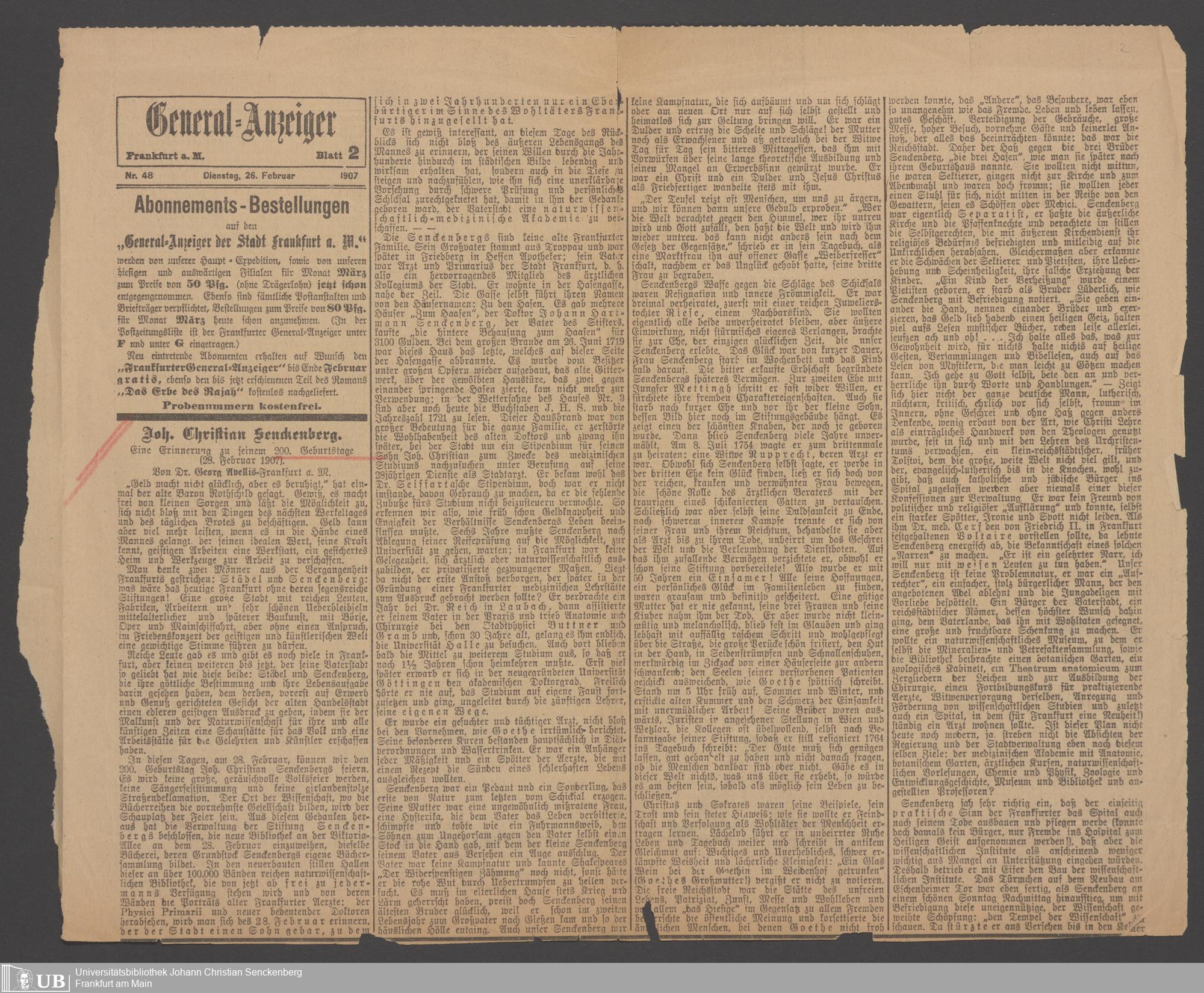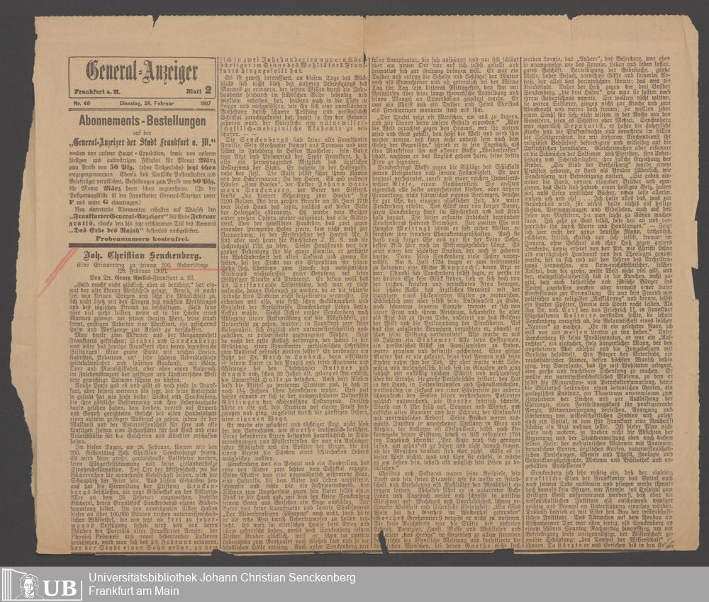 B 5 Dr. Senckenbergische Stiftung, 28 - Presseberichte und Festordnung zum 200. Geburtstag des Stifters