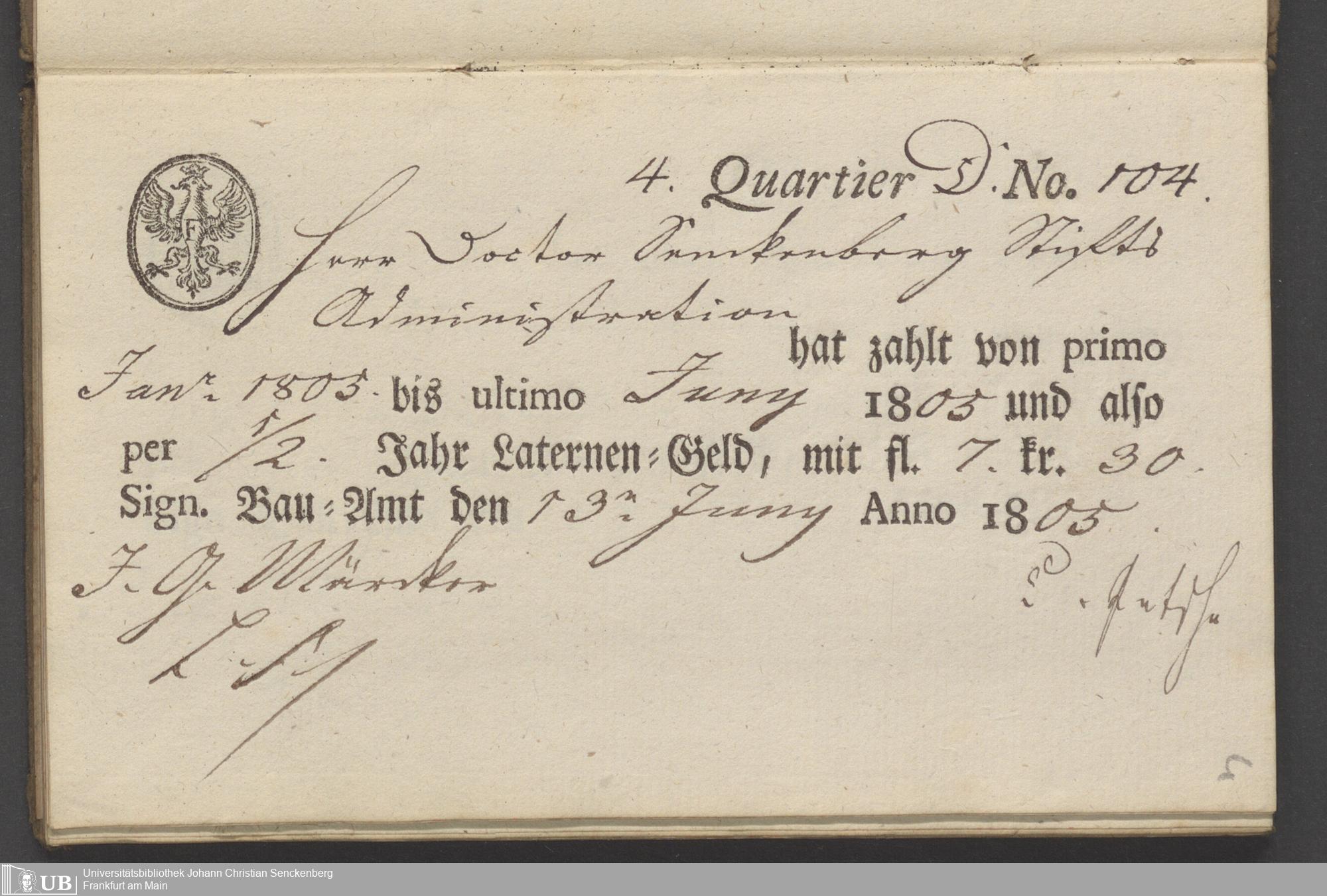 B 5 Dr. Senckenbergische Stiftung, 70 - Quittungsbuch der Senckenbergischen Administration über Laternengeld