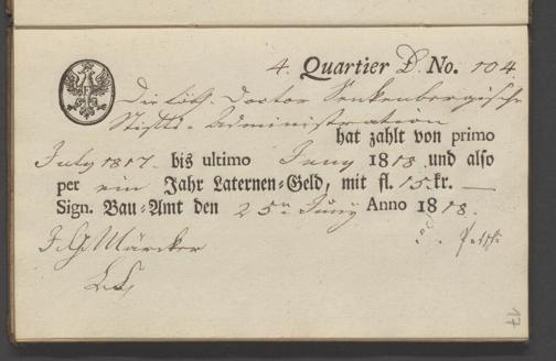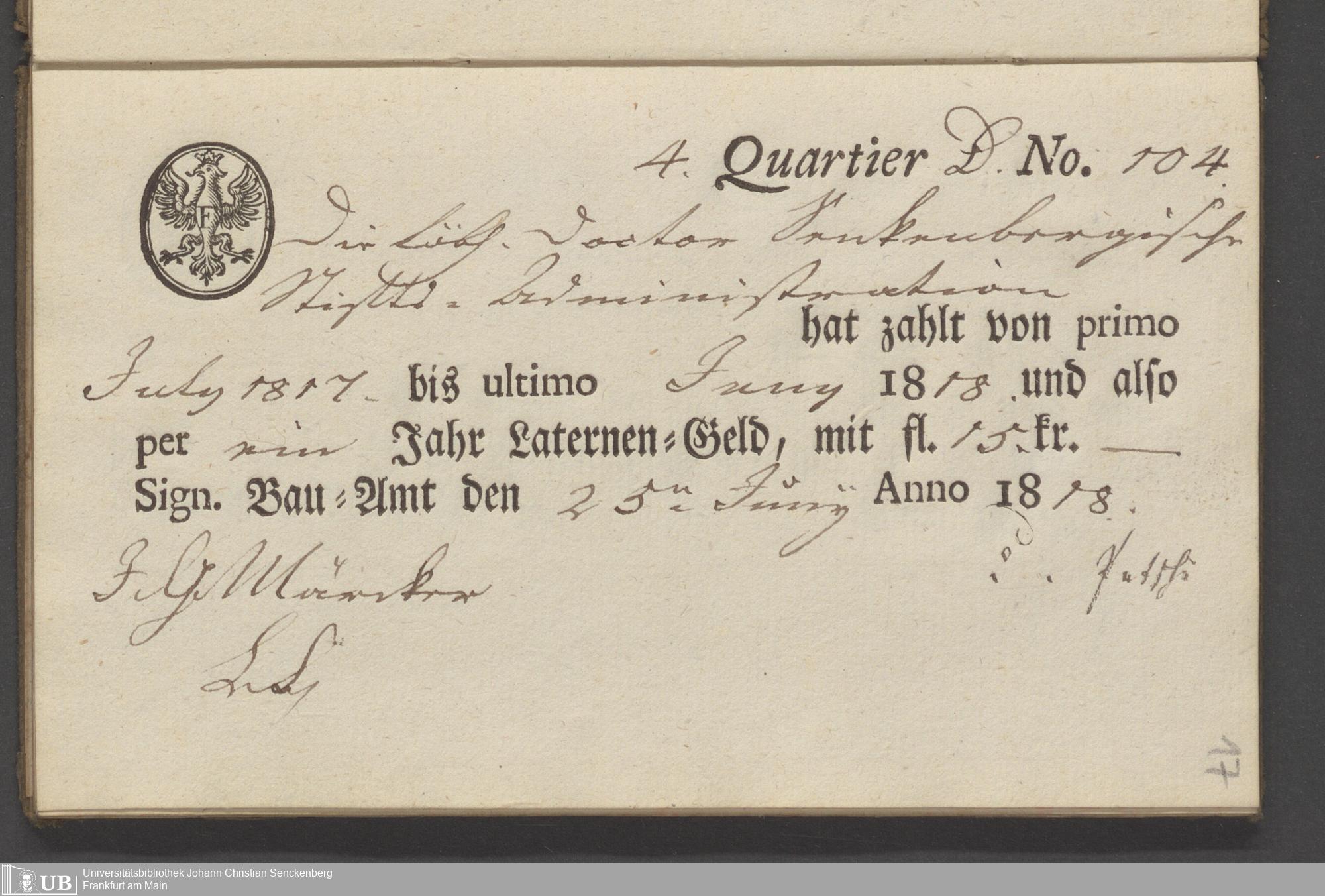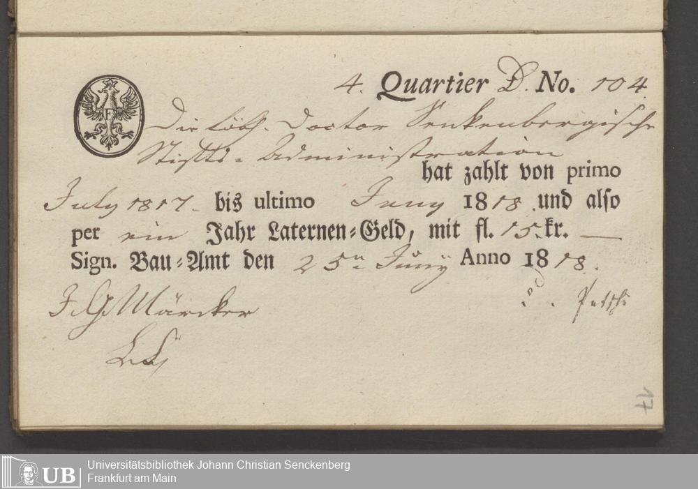 B 5 Dr. Senckenbergische Stiftung, 70 - Quittungsbuch der Senckenbergischen Administration über Laternengeld