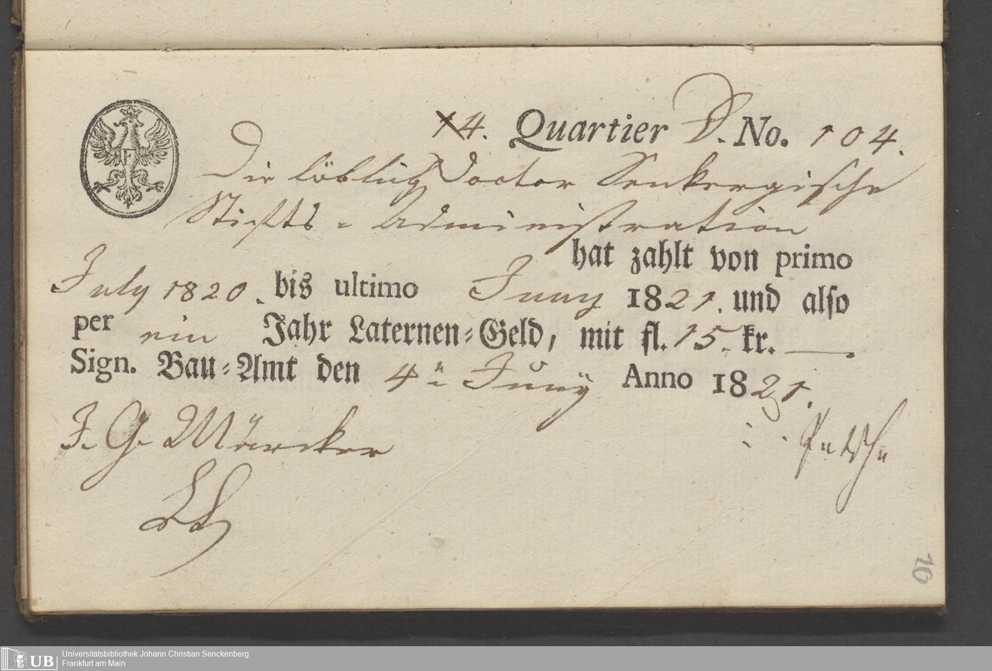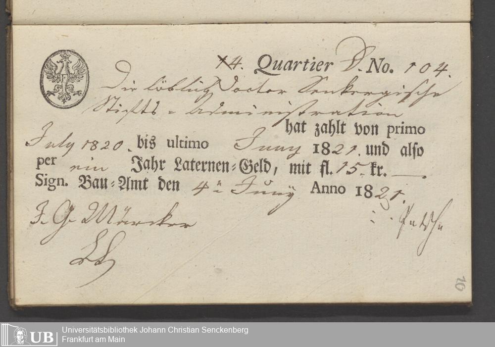 B 5 Dr. Senckenbergische Stiftung, 70 - Quittungsbuch der Senckenbergischen Administration über Laternengeld