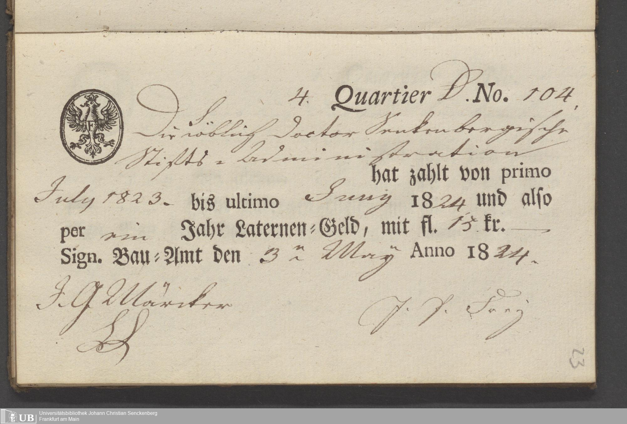 B 5 Dr. Senckenbergische Stiftung, 70 - Quittungsbuch der Senckenbergischen Administration über Laternengeld