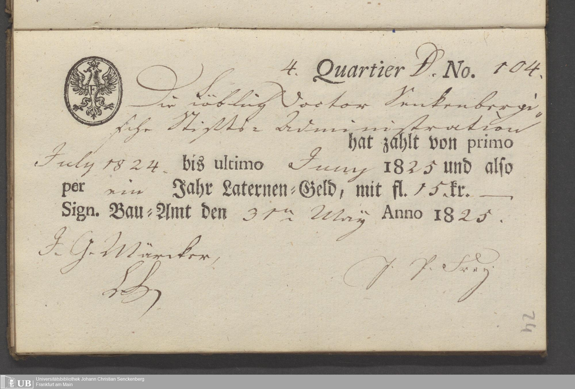 B 5 Dr. Senckenbergische Stiftung, 70 - Quittungsbuch der Senckenbergischen Administration über Laternengeld