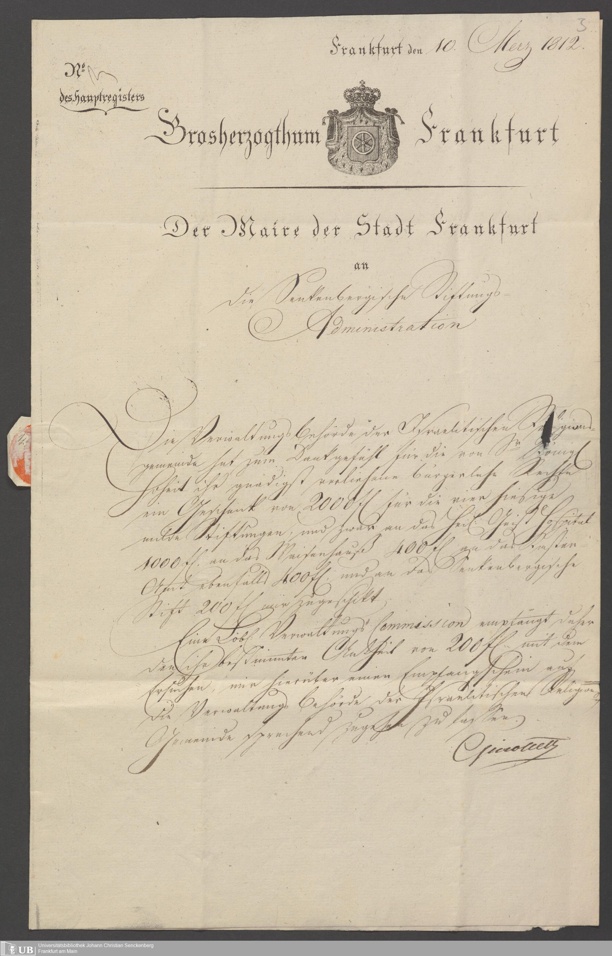 B 5 Dr. Senckenbergische Stiftung, 71 - Schenkung der Judenschaft wegen erlangten Bürgerrechts