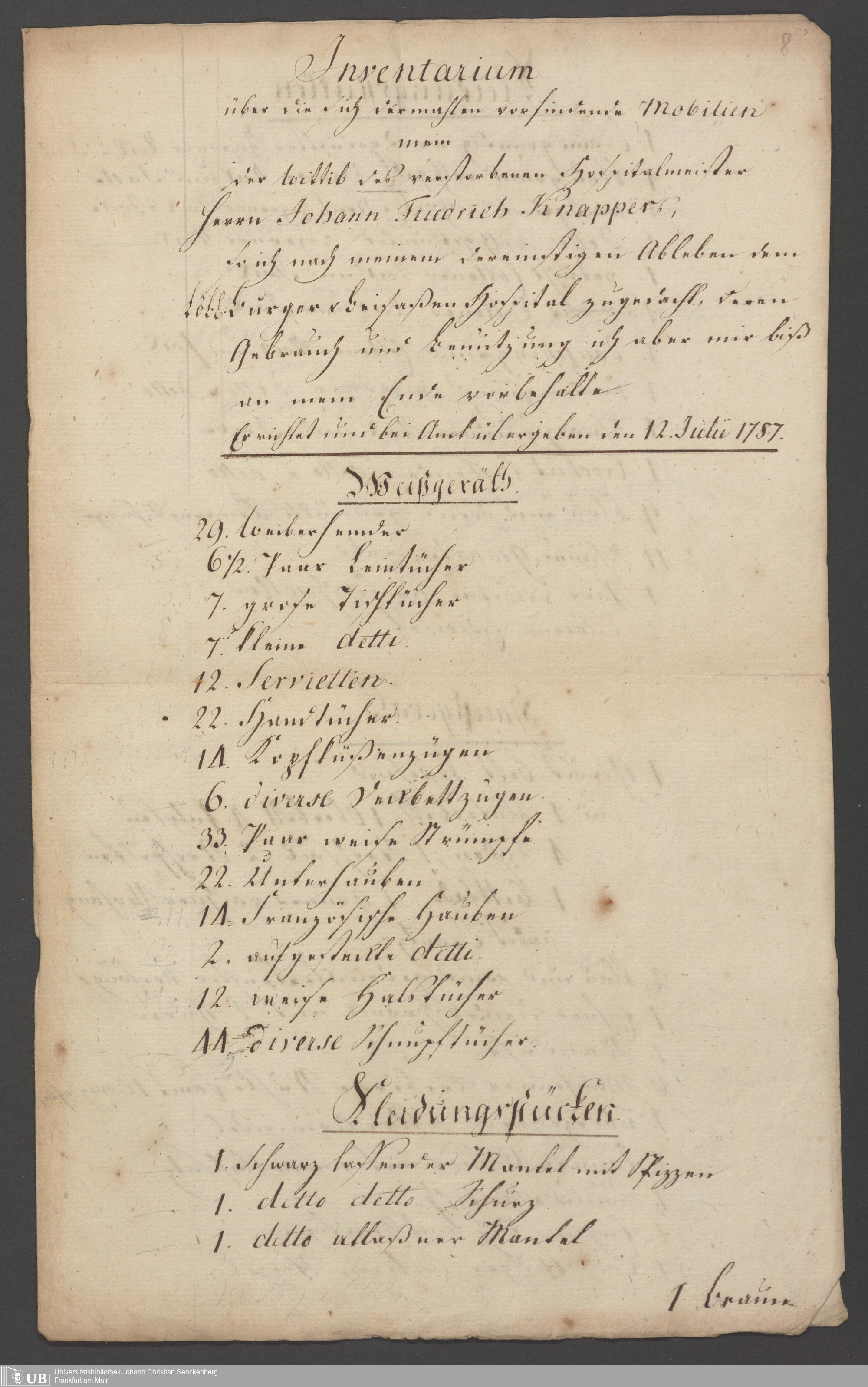 B 5 Dr. Senckenbergische Stiftung, 89 - Testament Hospitalmeister Knapper