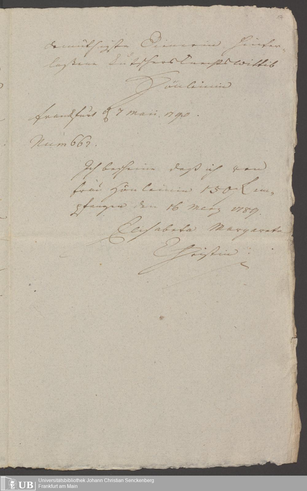 B 5 Dr. Senckenbergische Stiftung, 125 - Schenkung und Testament Maria Hühnlein