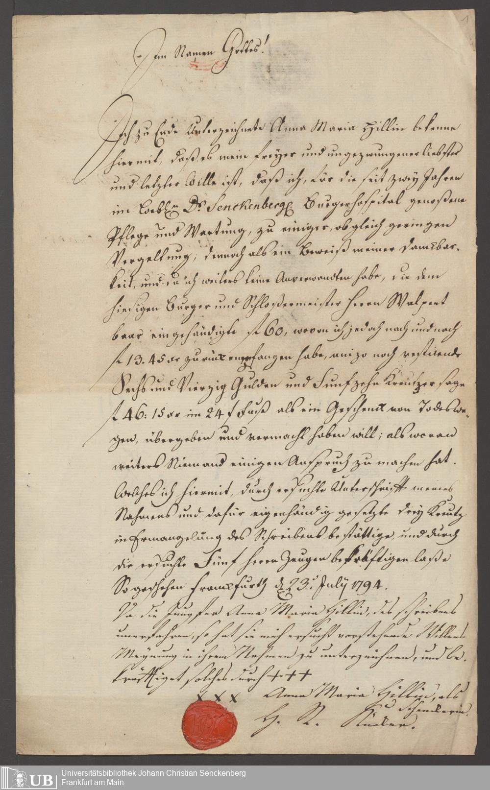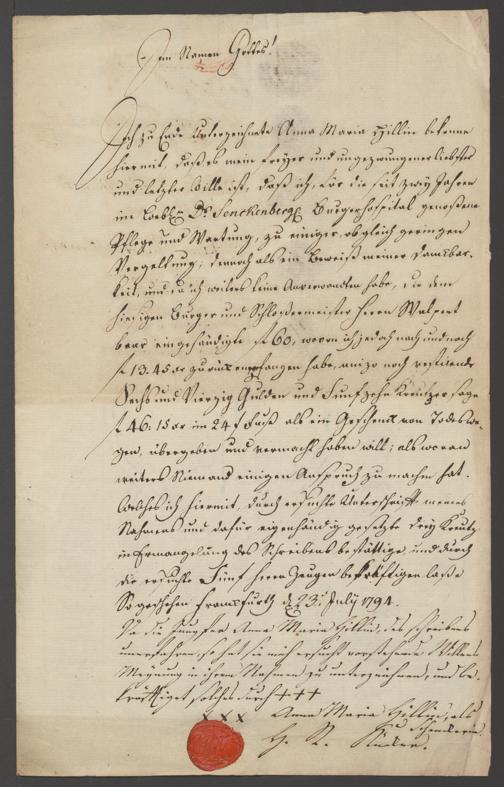 B 5 Dr. Senckenbergische Stiftung, 127 - Testament Anna Maria Hillin