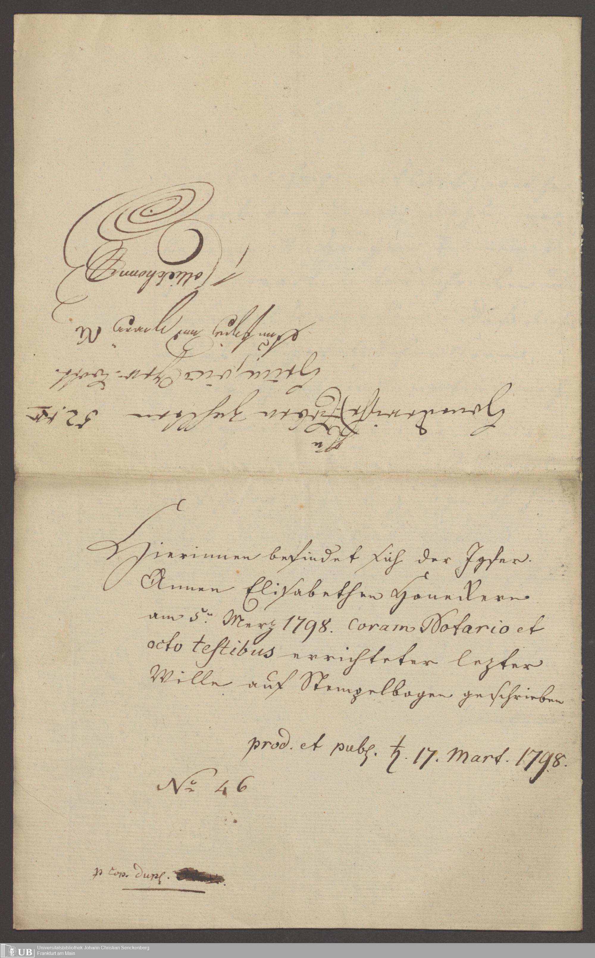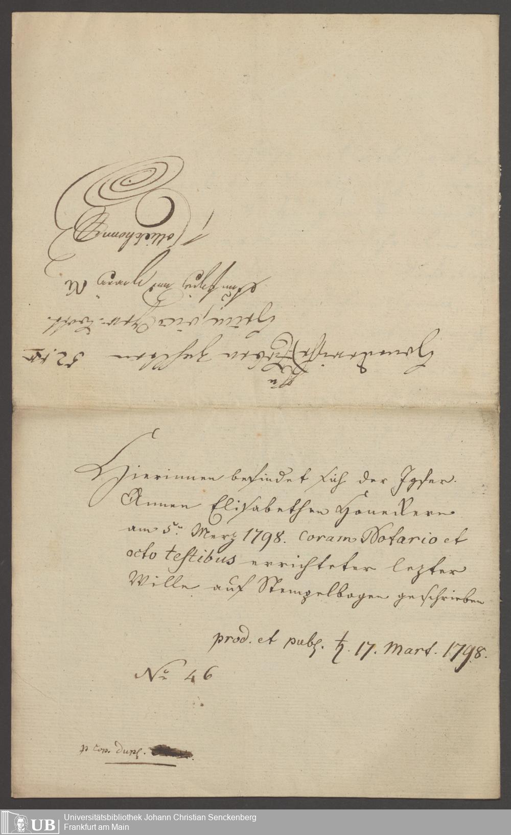 B 5 Dr. Senckenbergische Stiftung, 129 - Testament Anna Elisabeth Honneckerin