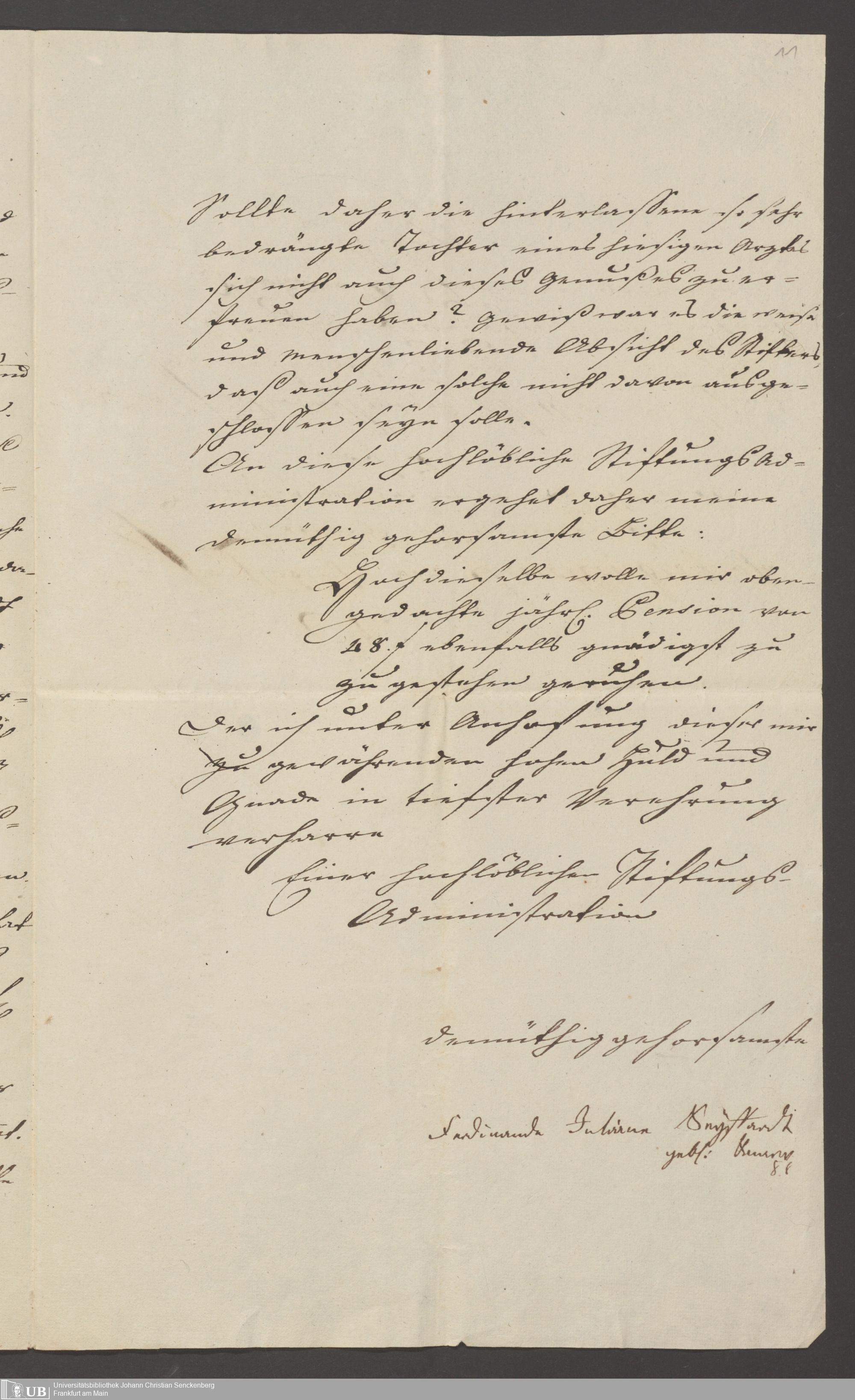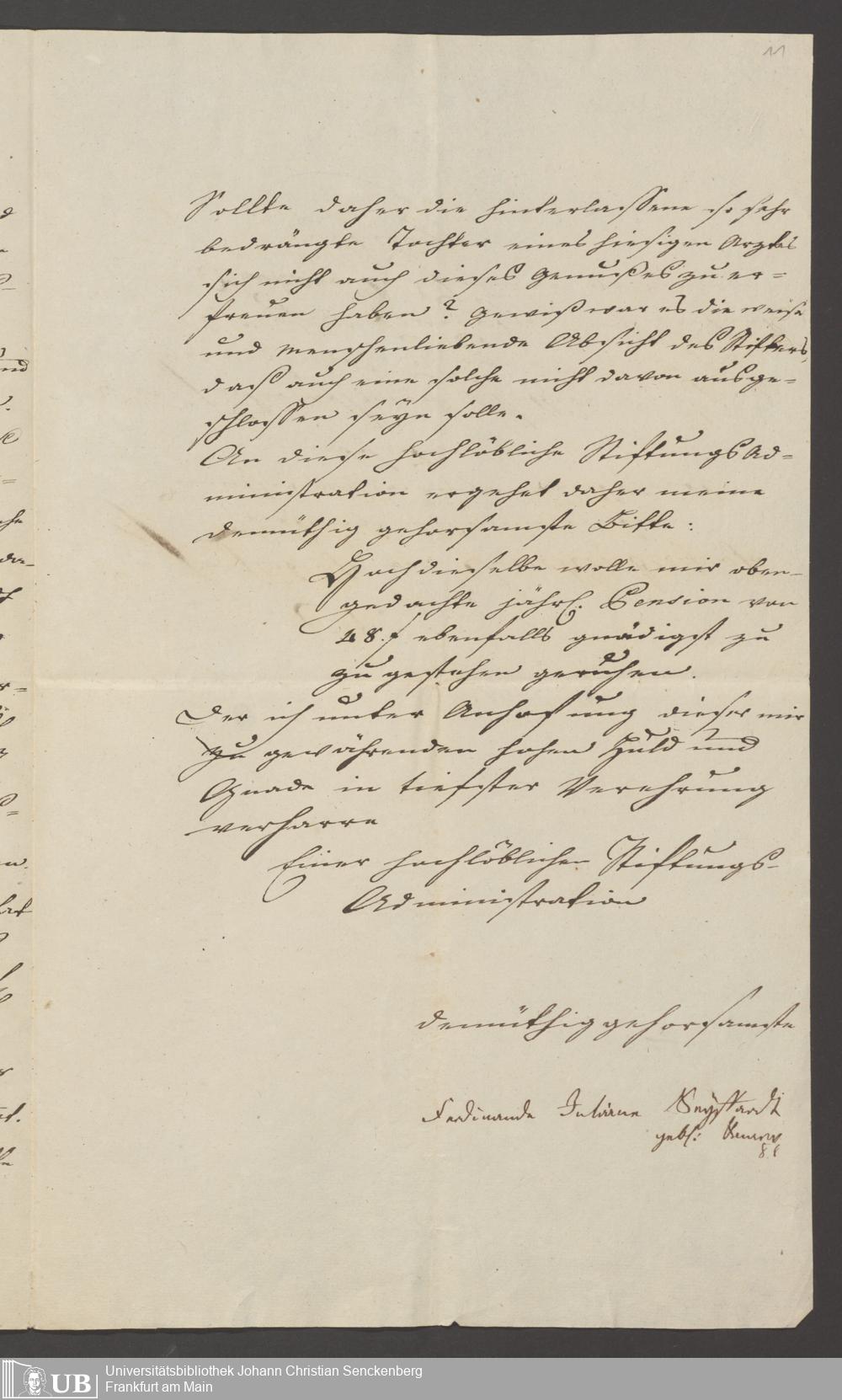 B 5 Dr. Senckenbergische Stiftung, 139 - Erklärung der Administration auf einen Antrag auf Zahlung von Witwenpensionen