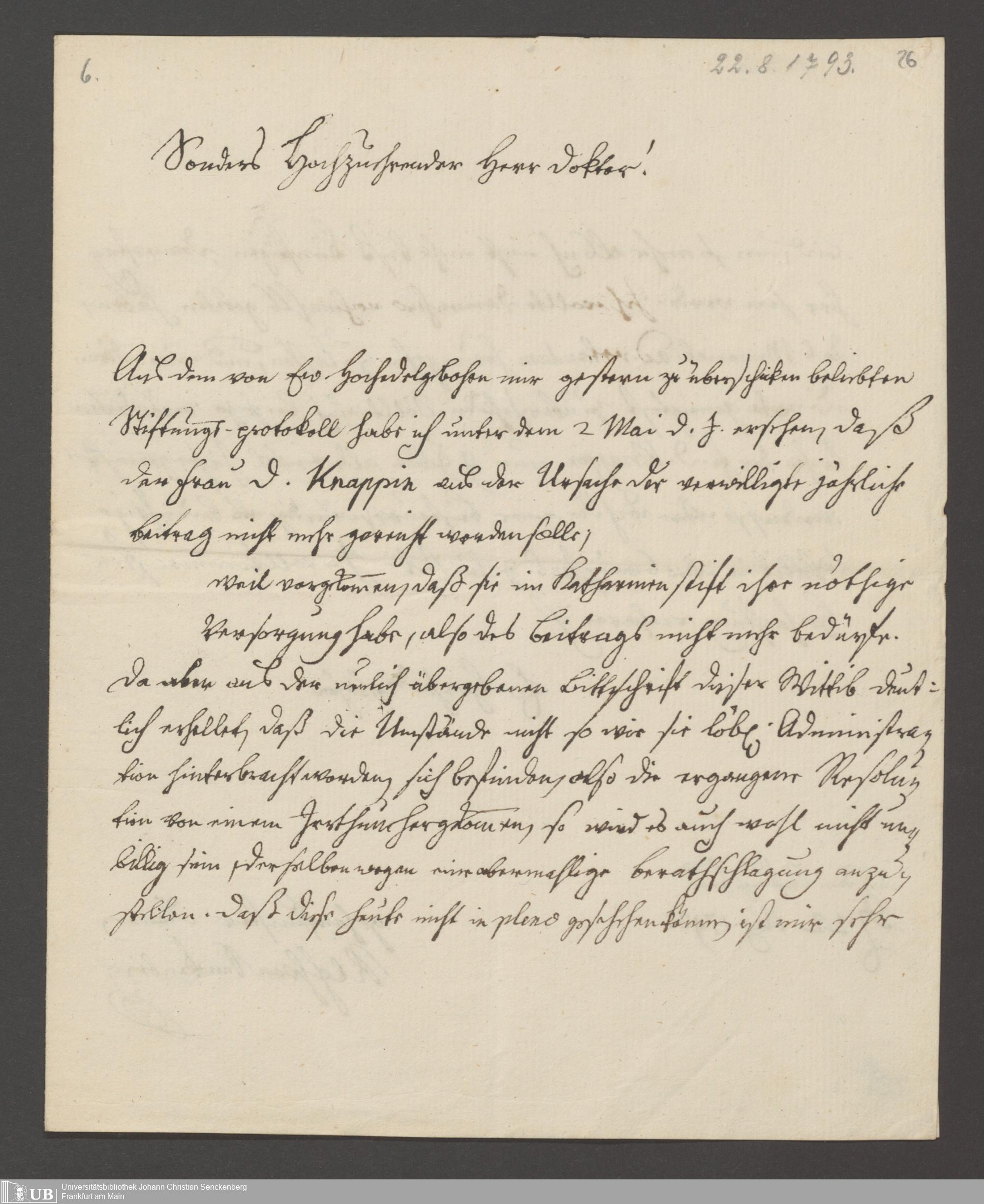 B 5 Dr. Senckenbergische Stiftung, 139 - Erklärung der Administration auf einen Antrag auf Zahlung von Witwenpensionen