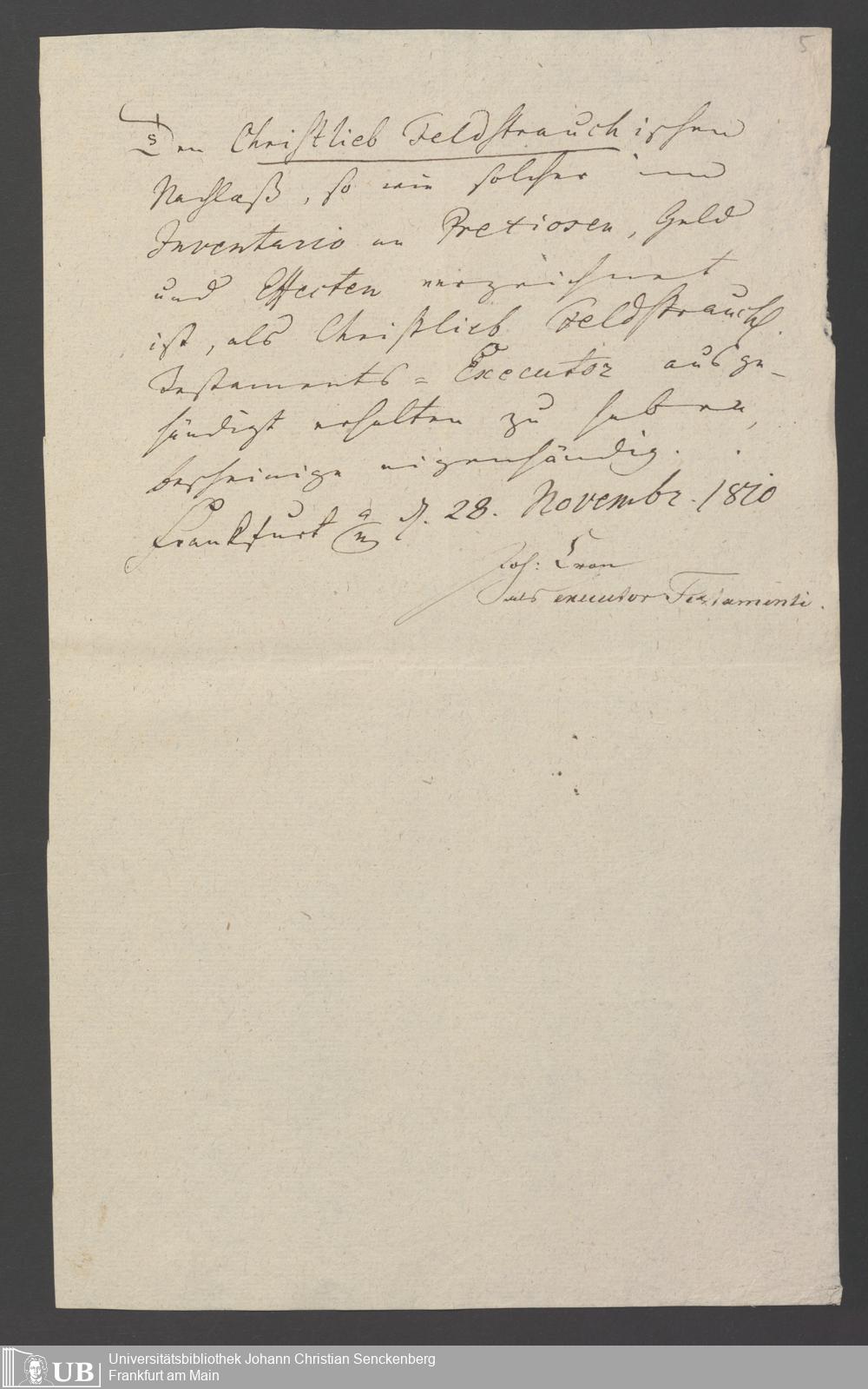 B 5 Dr. Senckenbergische Stiftung, 158 - Nachlassinventar Christlieb Feldstrauch
