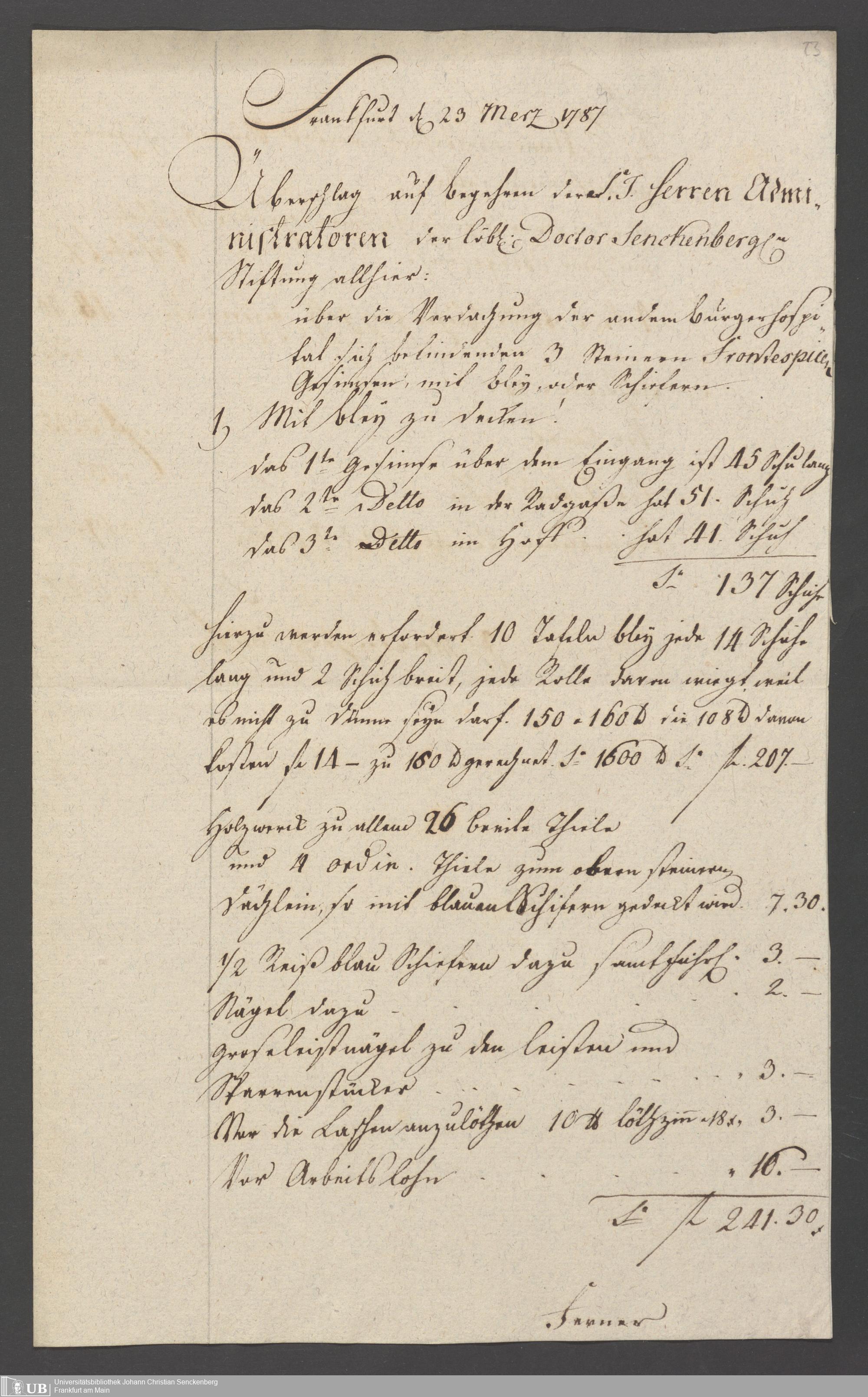 B 5 Dr. Senckenbergische Stiftung, 191 - Überschläge der Handwerker zur Fertigstellung des Bürgerhospitals