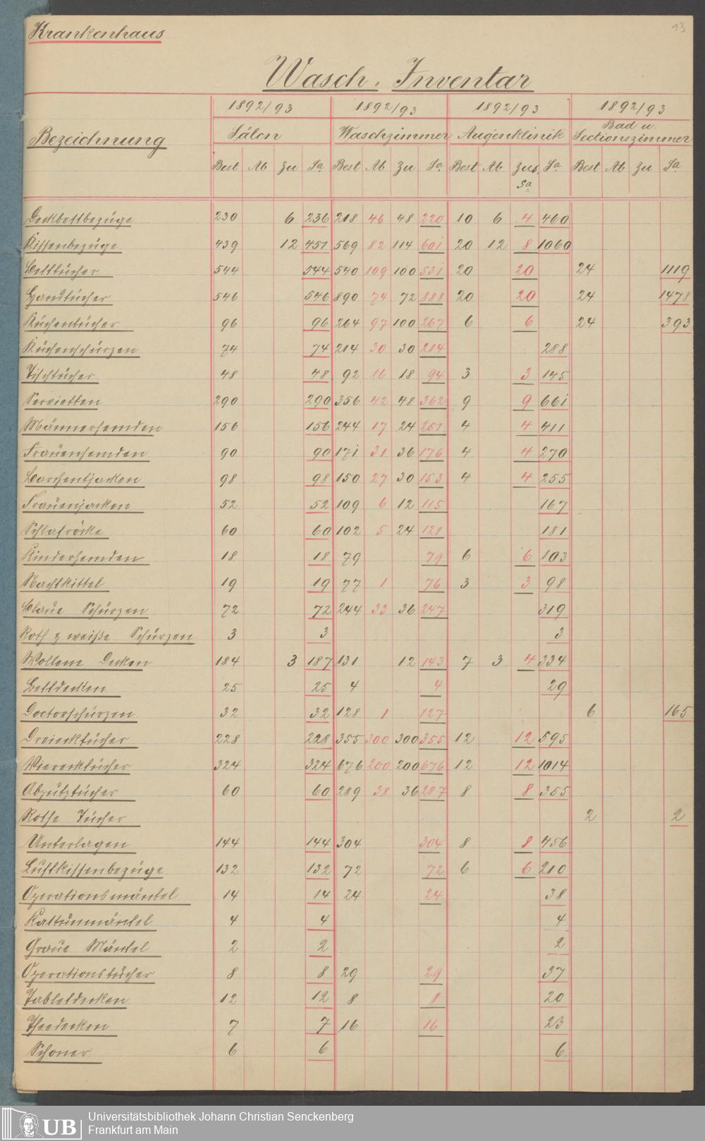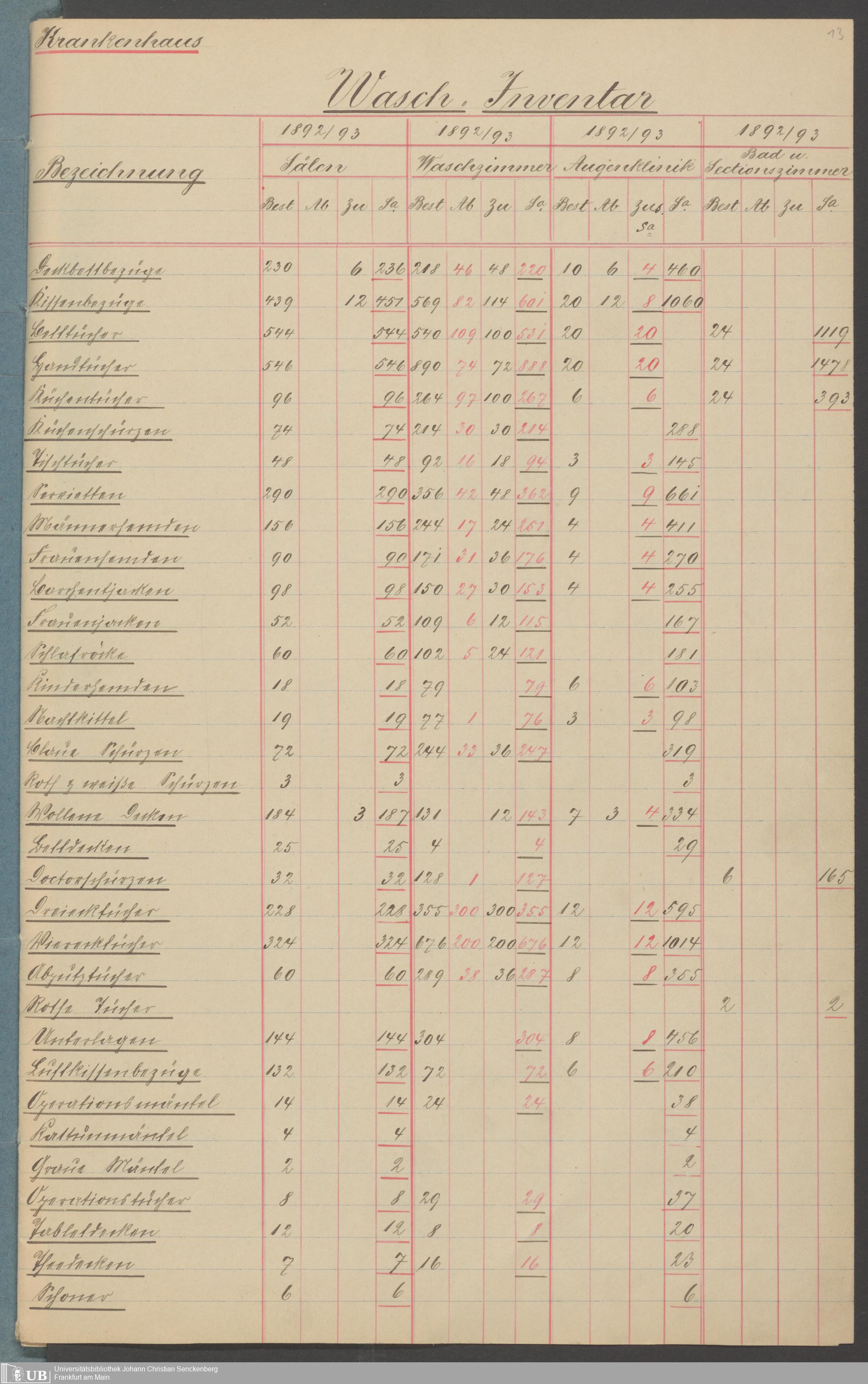 B 5 Dr. Senckenbergische Stiftung, 210 - Wäsche und Geschirrinventare des Krankenhauses und der Pfründner
