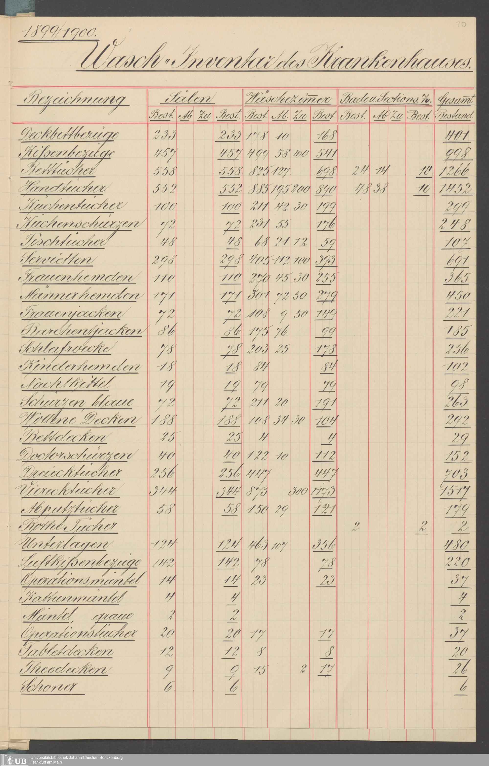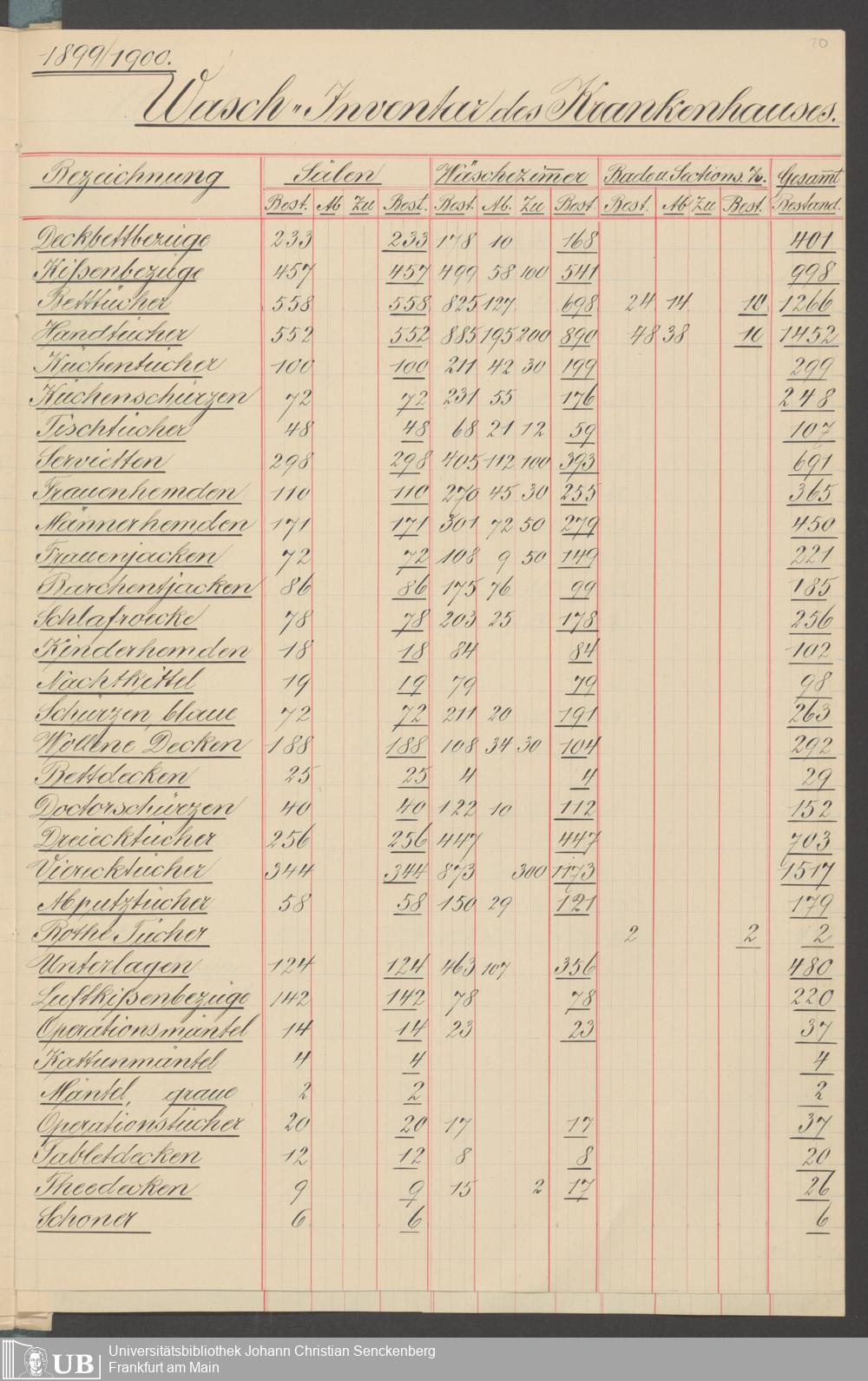 B 5 Dr. Senckenbergische Stiftung, 210 - Wäsche und Geschirrinventare des Krankenhauses und der Pfründner