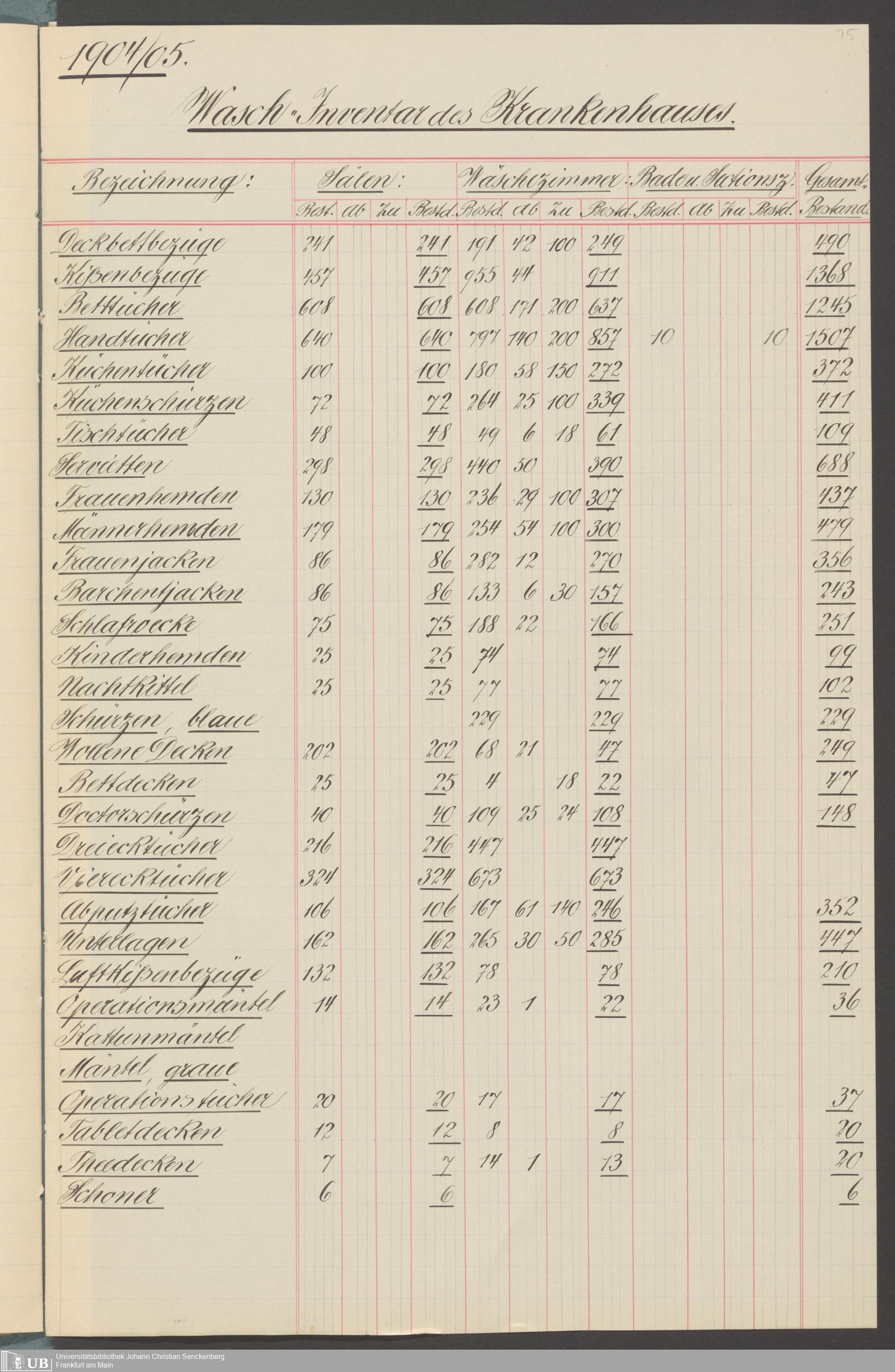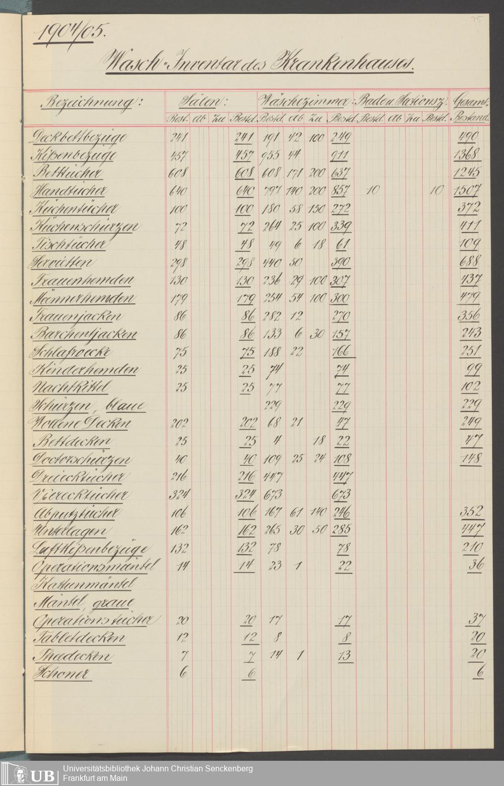 B 5 Dr. Senckenbergische Stiftung, 210 - Wäsche und Geschirrinventare des Krankenhauses und der Pfründner