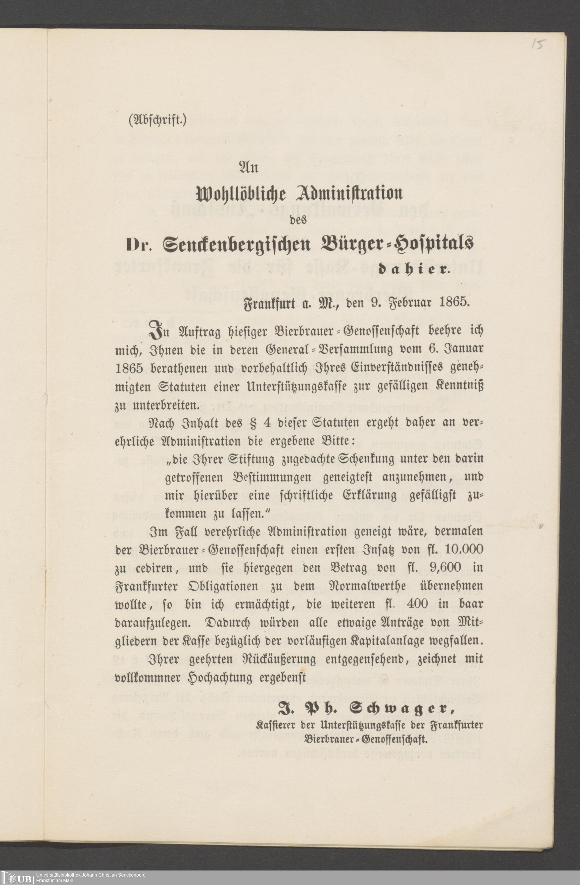 B 5 Dr. Senckenbergische Stiftung, 218 - Schreiben der Geschworenen des Bierbrauer- Handwerks an die Administration