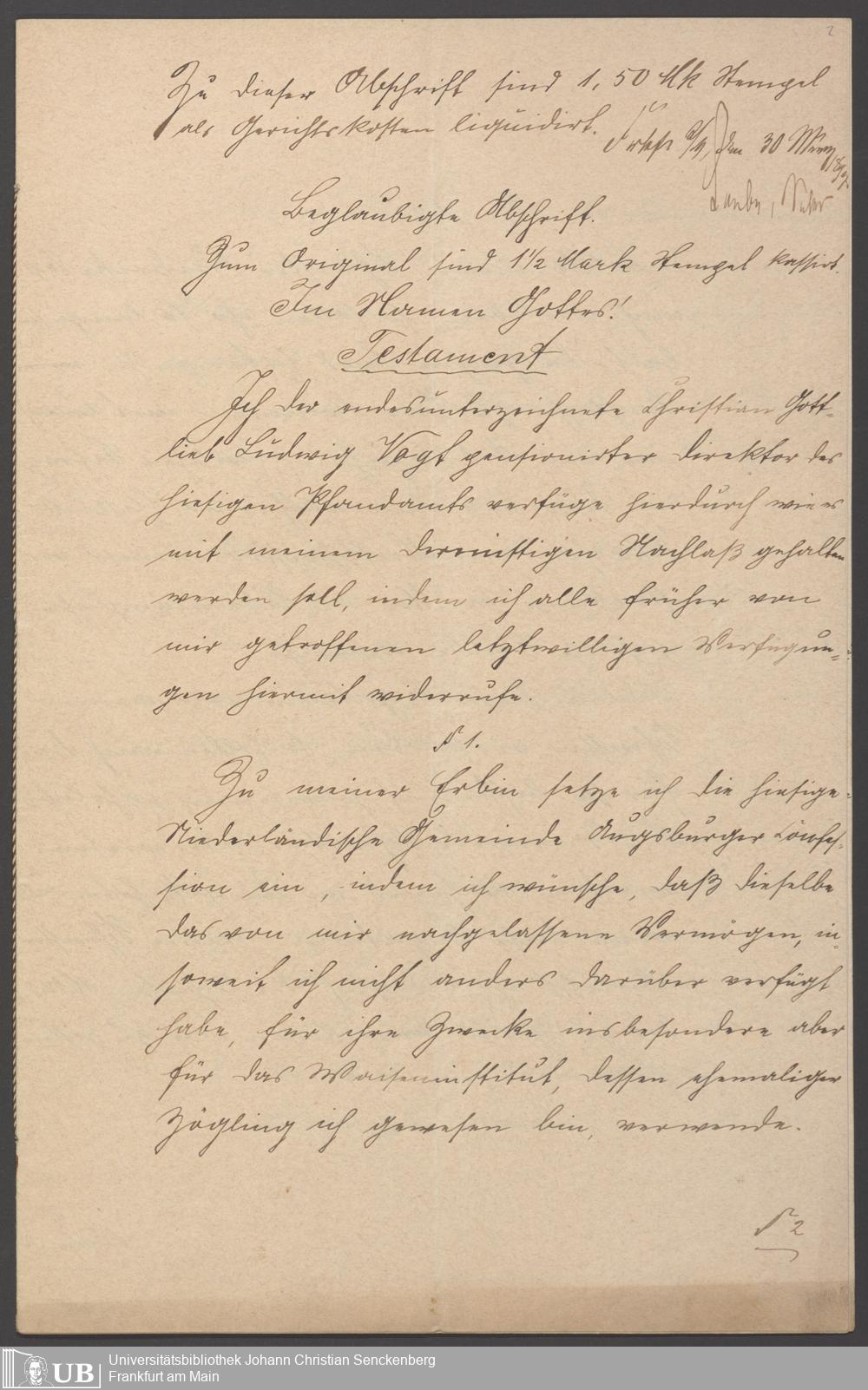 B 5 Dr. Senckenbergische Stiftung, 264 - Testament Gottlieb Ludwig Vogt