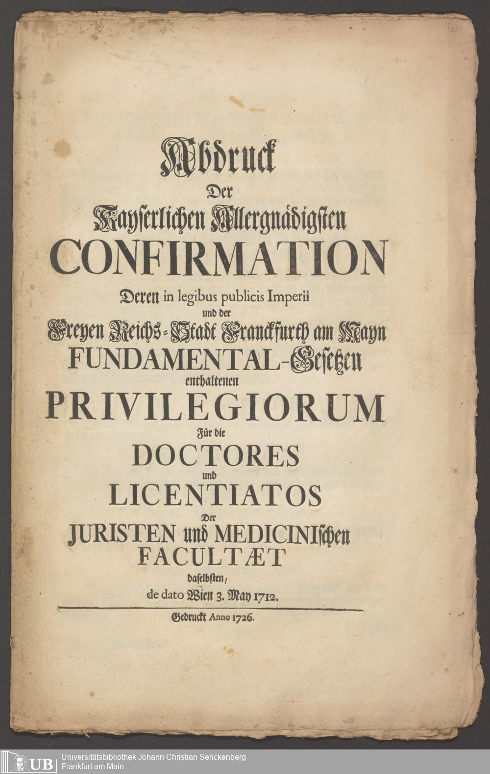 B 5 Dr. Senckenbergische Stiftung, 267 - Abdruck der Privilegien für Juristen und Mediziner in Frankfurt