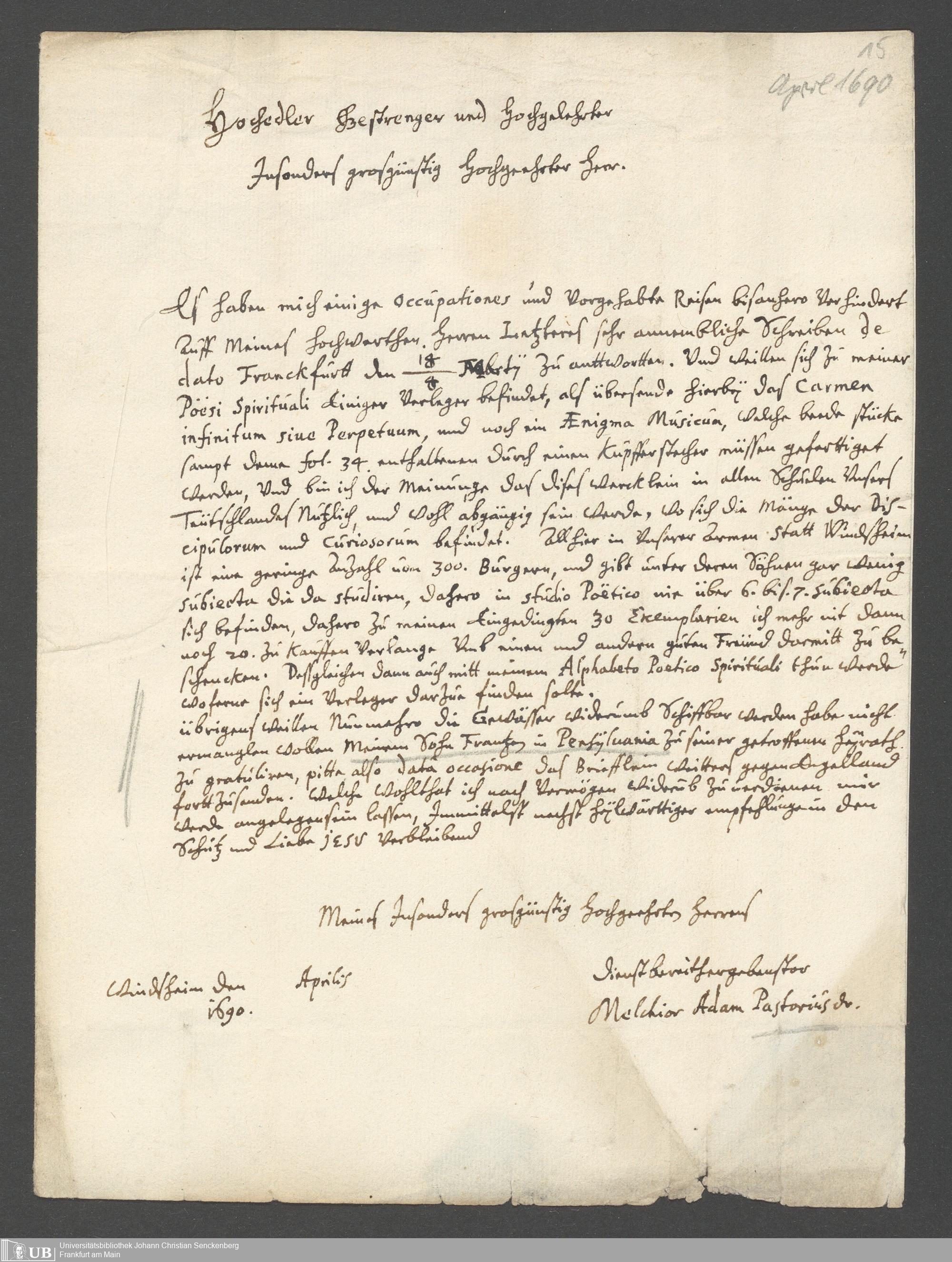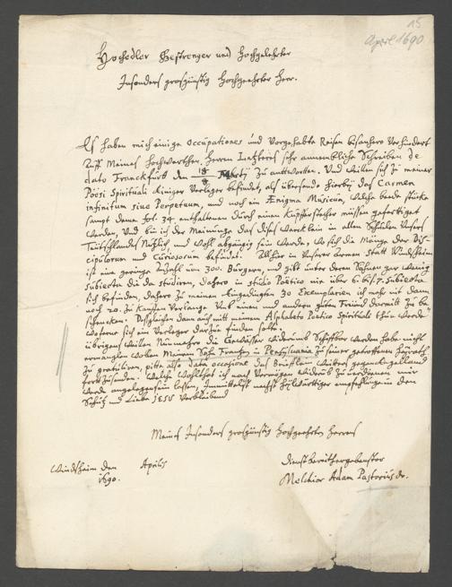 Brief an Doctor Schütz, 31. Dezember 1689