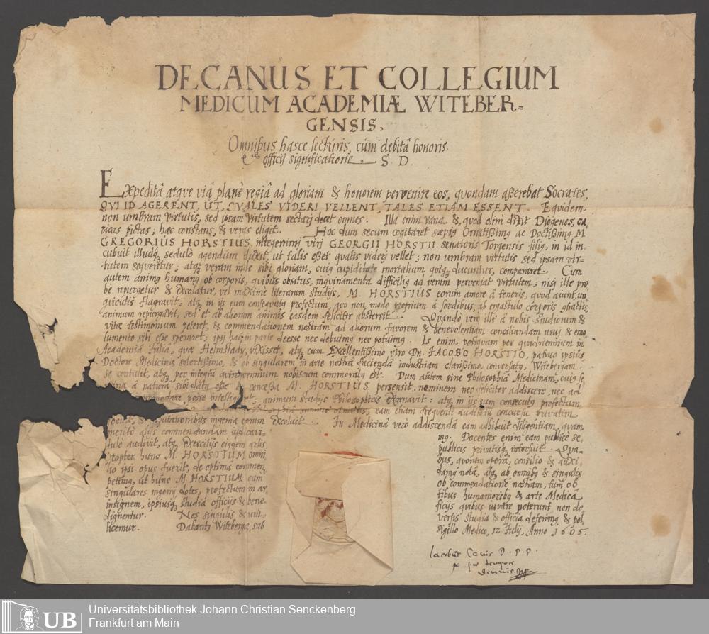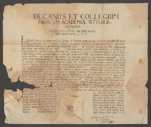 Zeugnis der Universität Wittenberg für Gregor Horst 1605