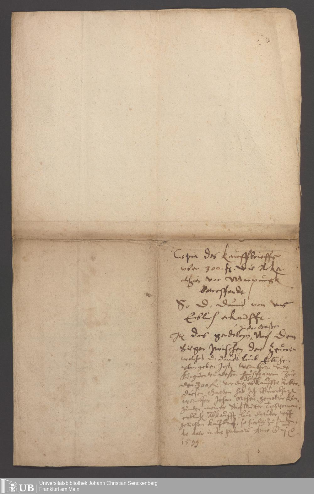 Kaufbrief über Acker und Wiesen der Eheleute Jost Wormbs zu Marburg, als Verkäufer und des Dr. David Lauck (?) als Käufer. Marburg 1587