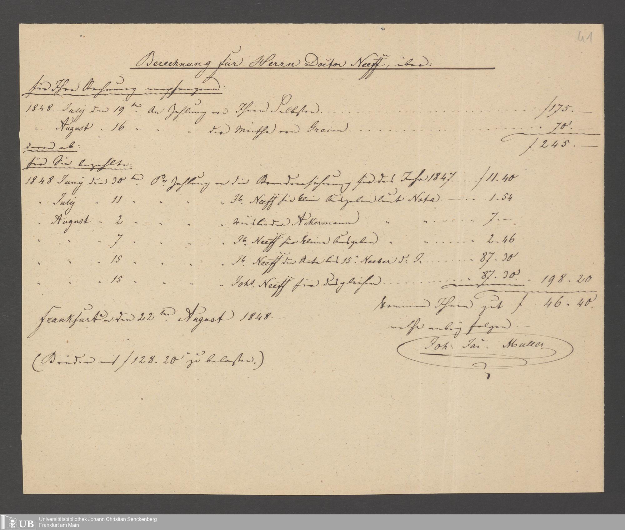 Na 83 Nachlass Christian Ernst Neeff, 3 - Abrechnungen von Johann Jakob Müller für Christian Ernst Neeff
