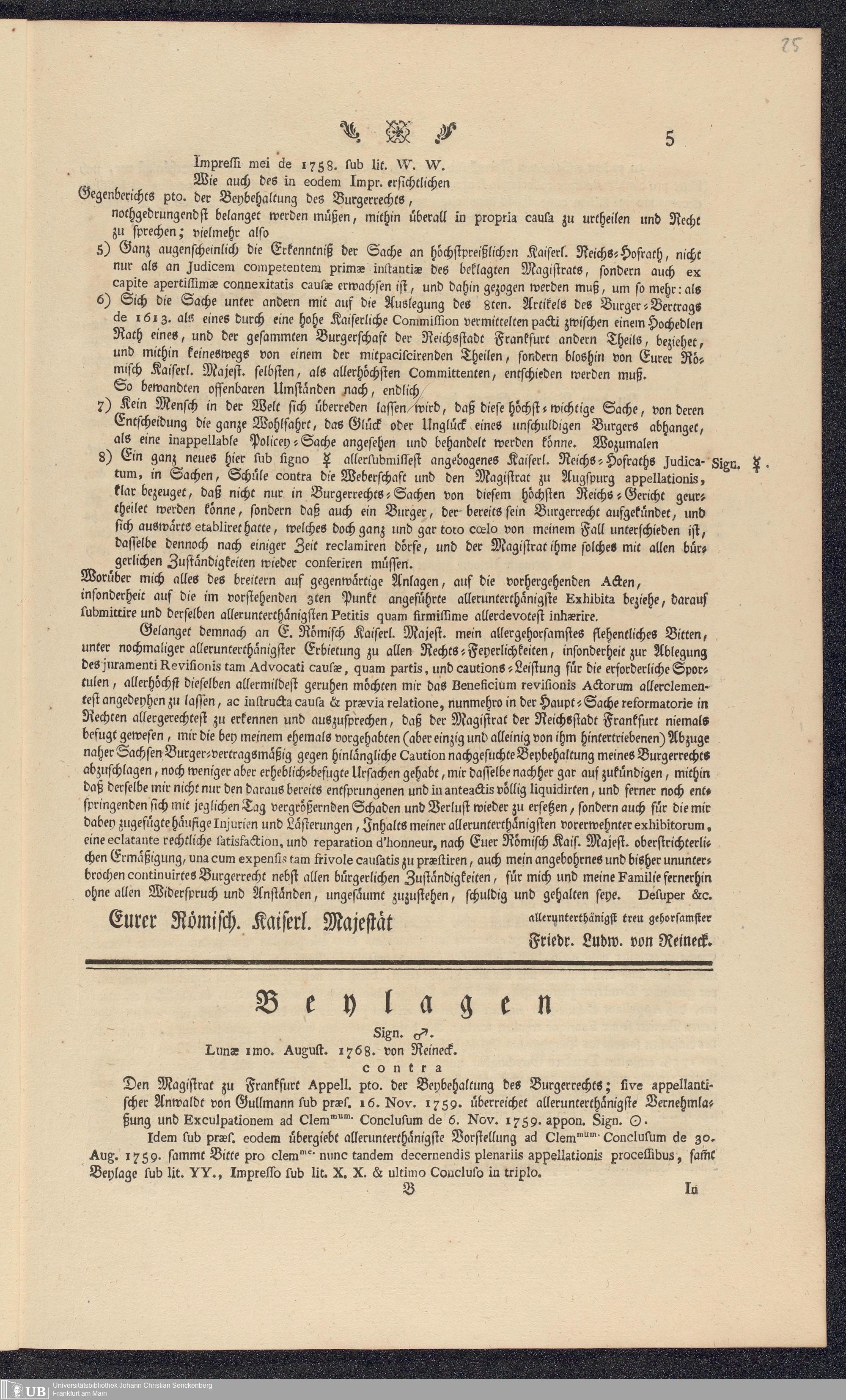 Na 31 Nachlass Johann Christian Senckenberg, 199 - Rechtsstreit zwischen von Reineck und dem Magistrat