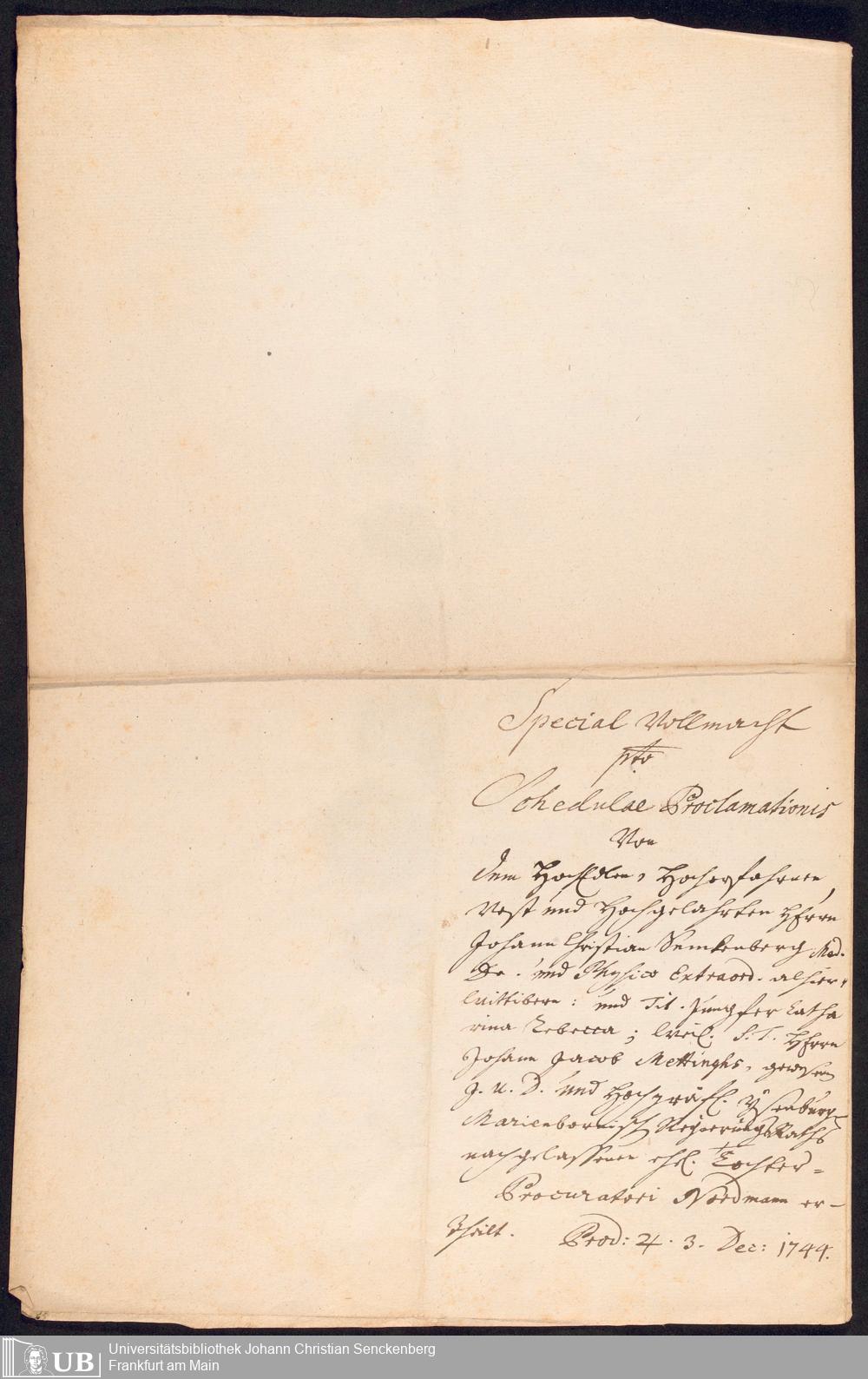 Na 31 Nachlass Johann Christian Senckenberg, 452 - Zwei Vollmachten für Prokurator Nordmann zur Bestellung des Aufgebotes