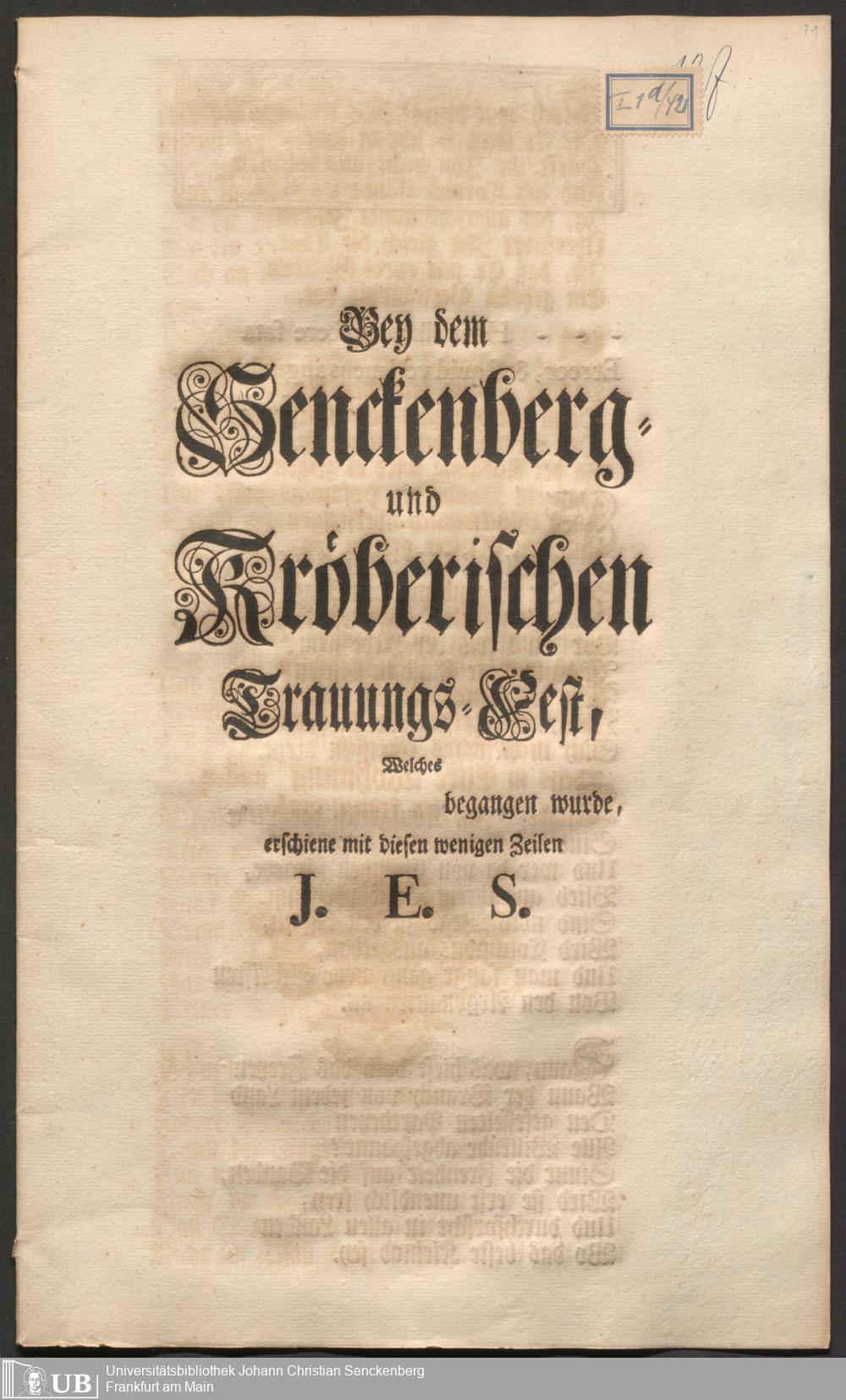 Na 31 Nachlass Johann Christian Senckenberg, 103 - Glückwunsch-Druckschrift zum Senckenberg und Kröberschen Trauungsfest