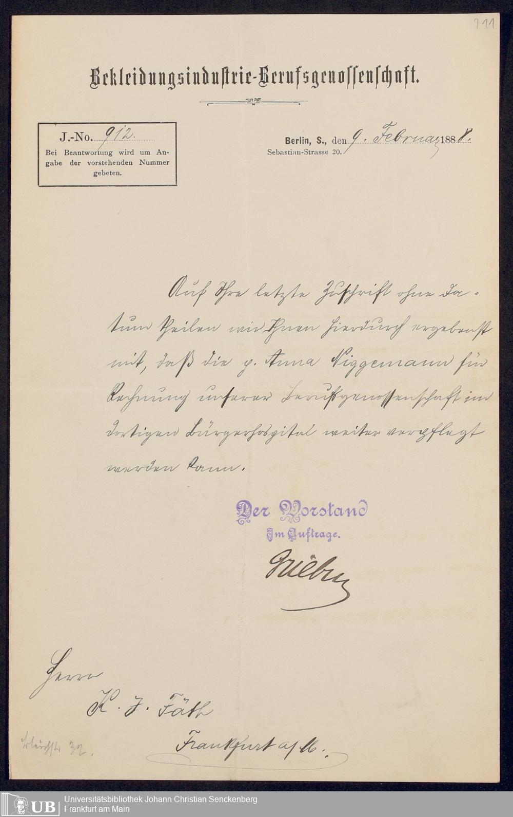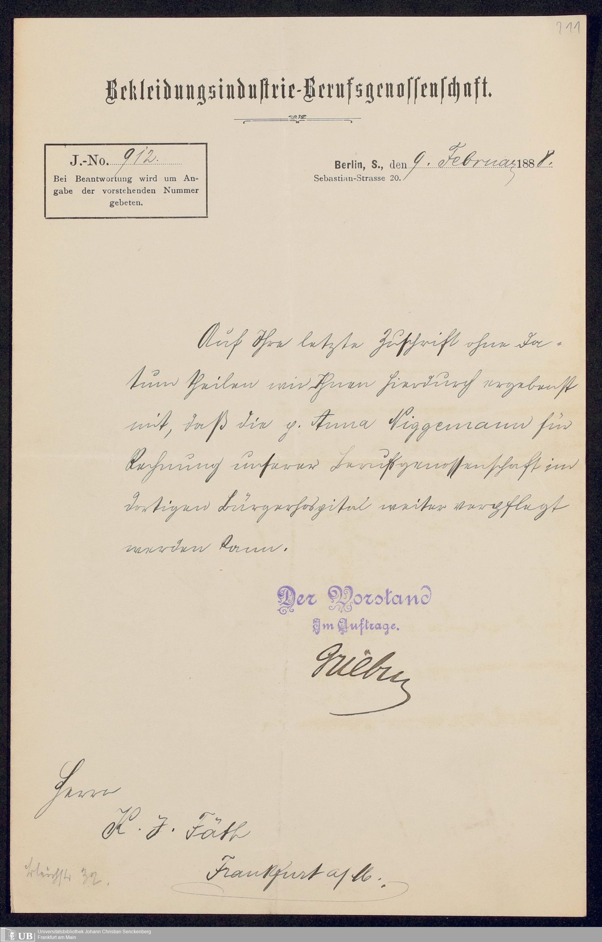 B 5 Dr. Senckenbergische Stiftung, 249 - Verhandlungen der Administration mit der Ortskrankenkasse