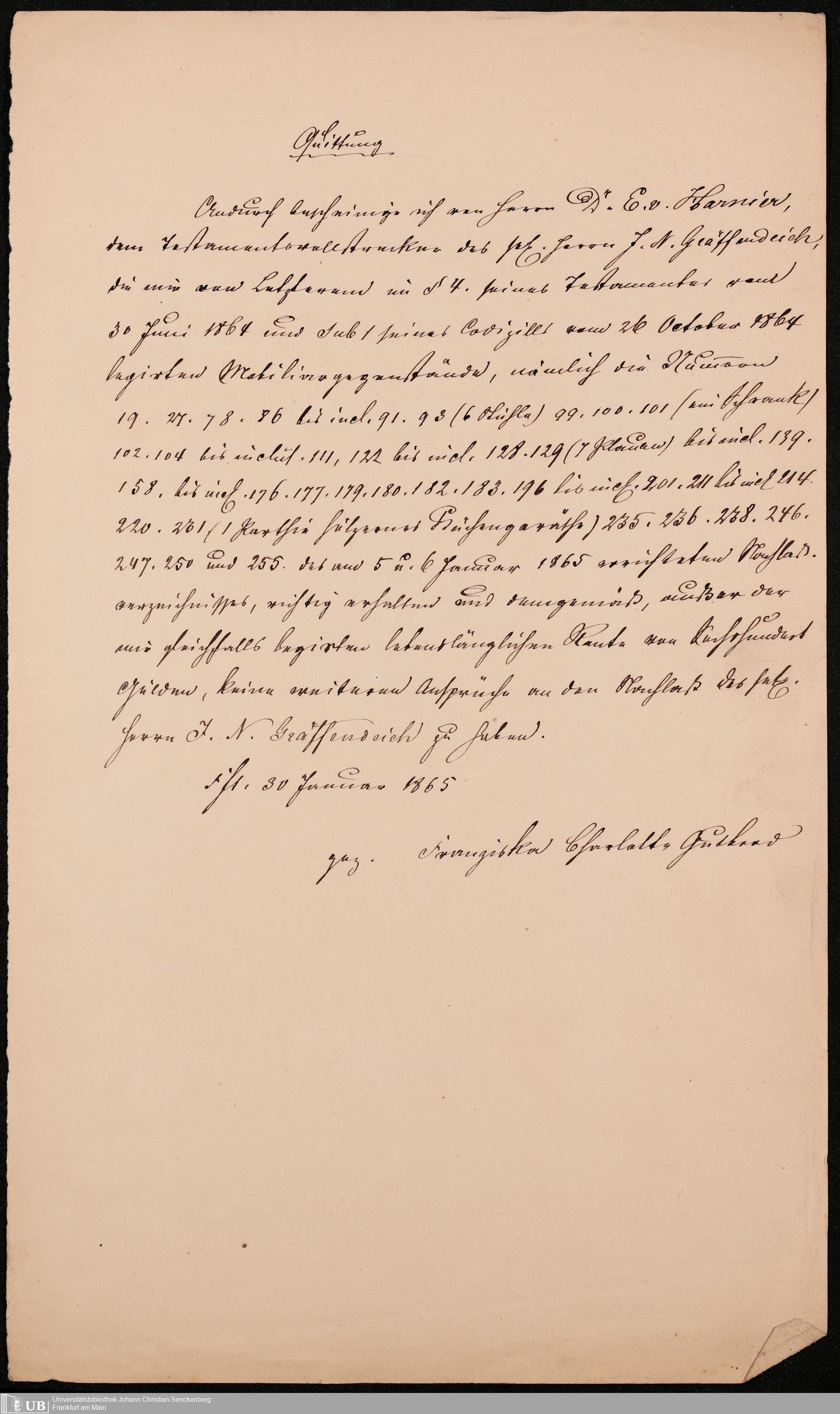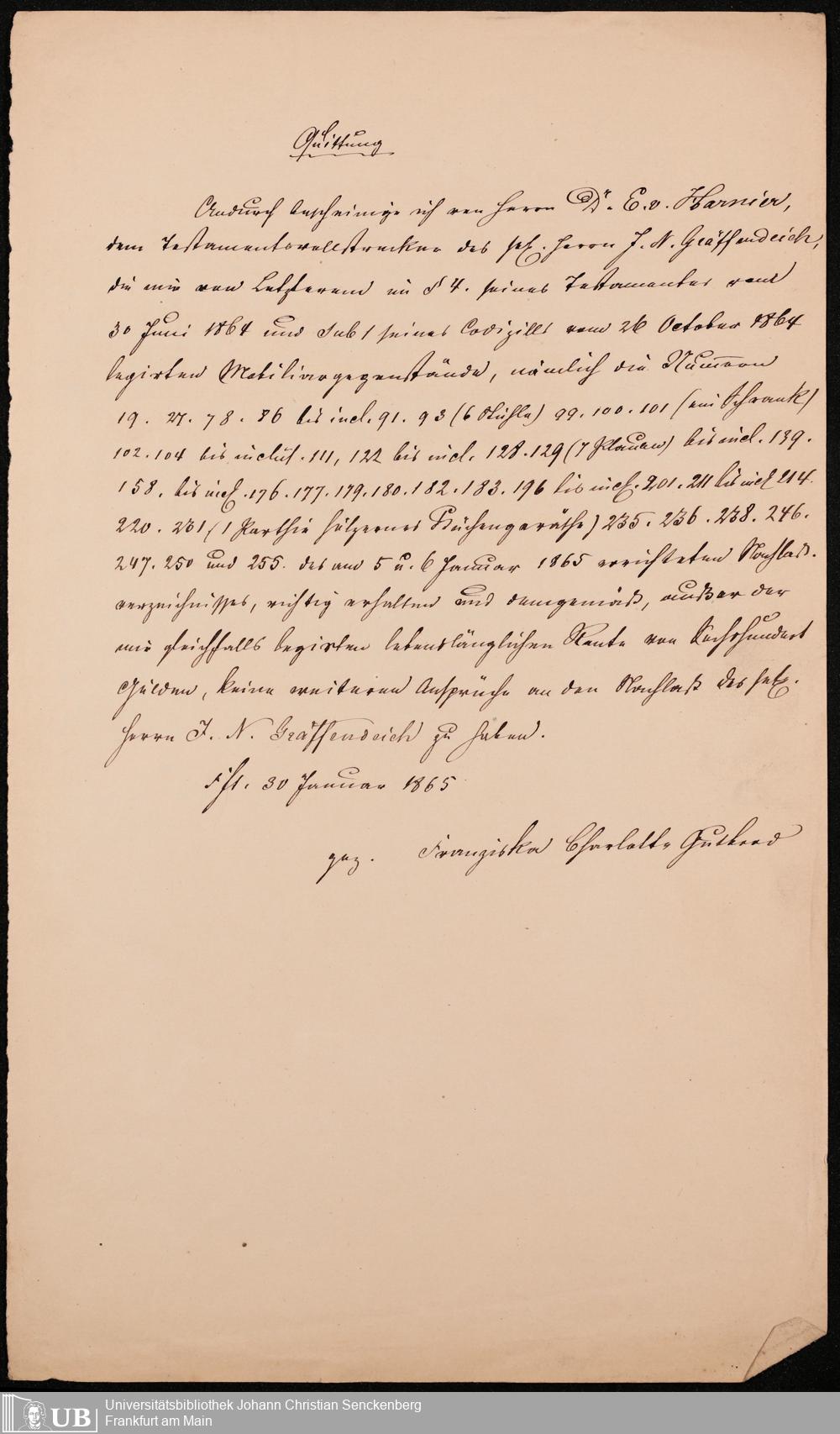 B 5 Dr. Senckenbergische Stiftung, 105 - Erbschaftspapier Gräffendeich