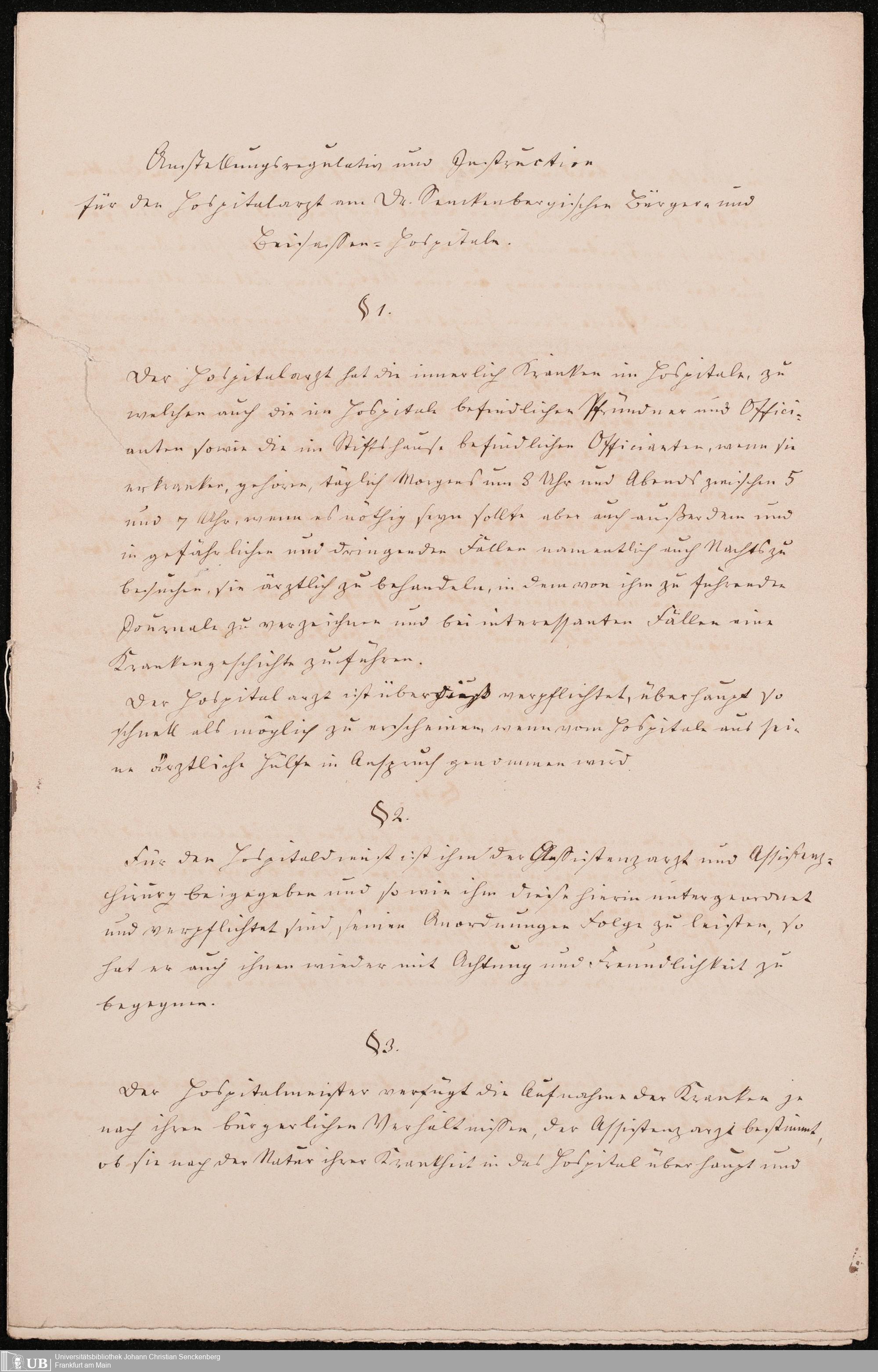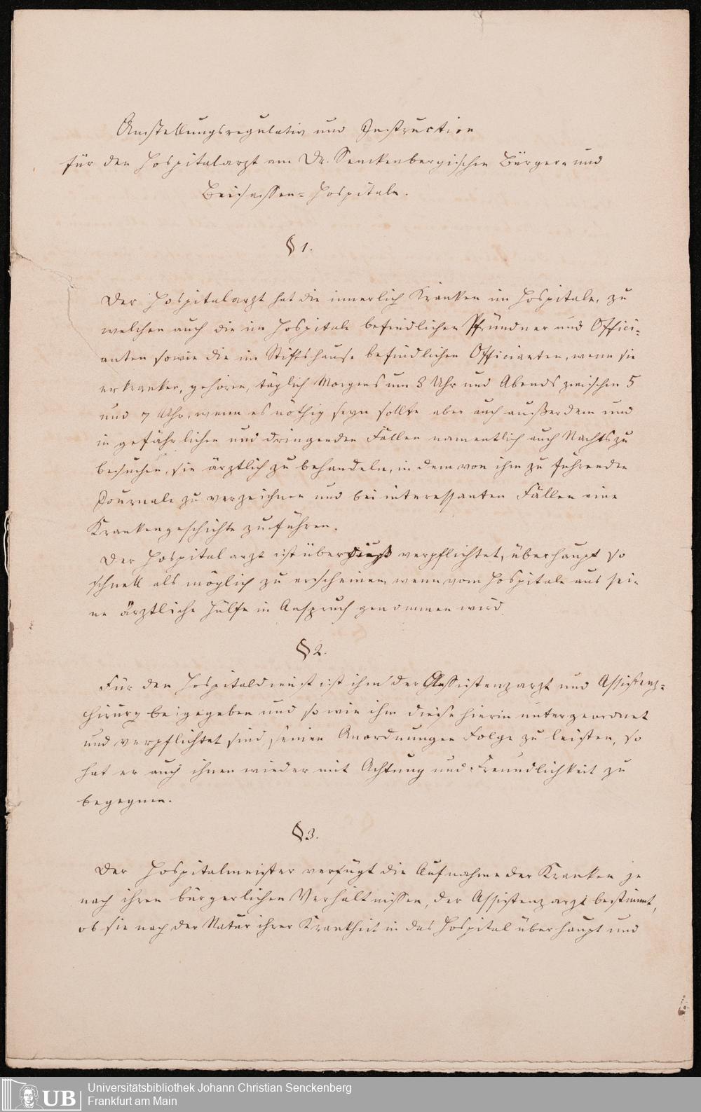 B 5 Dr. Senckenbergische Stiftung, 215 - Anstellungsregulativ und Instruktion für die Ärzte im Hospital