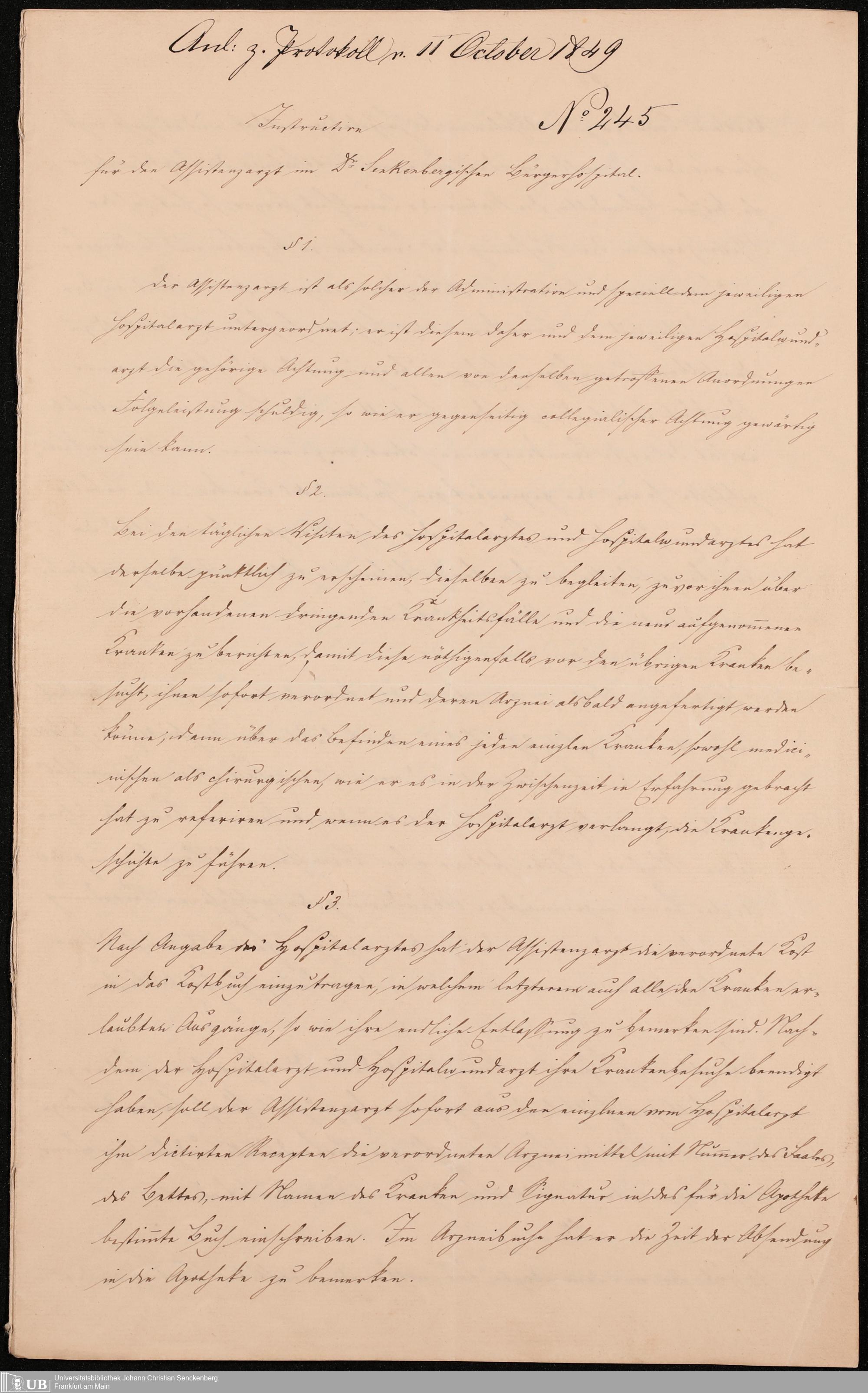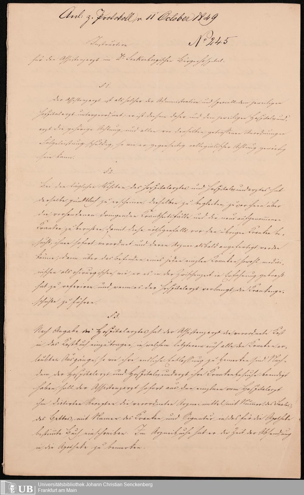 B 5 Dr. Senckenbergische Stiftung, 215 - Anstellungsregulativ und Instruktion für die Ärzte im Hospital
