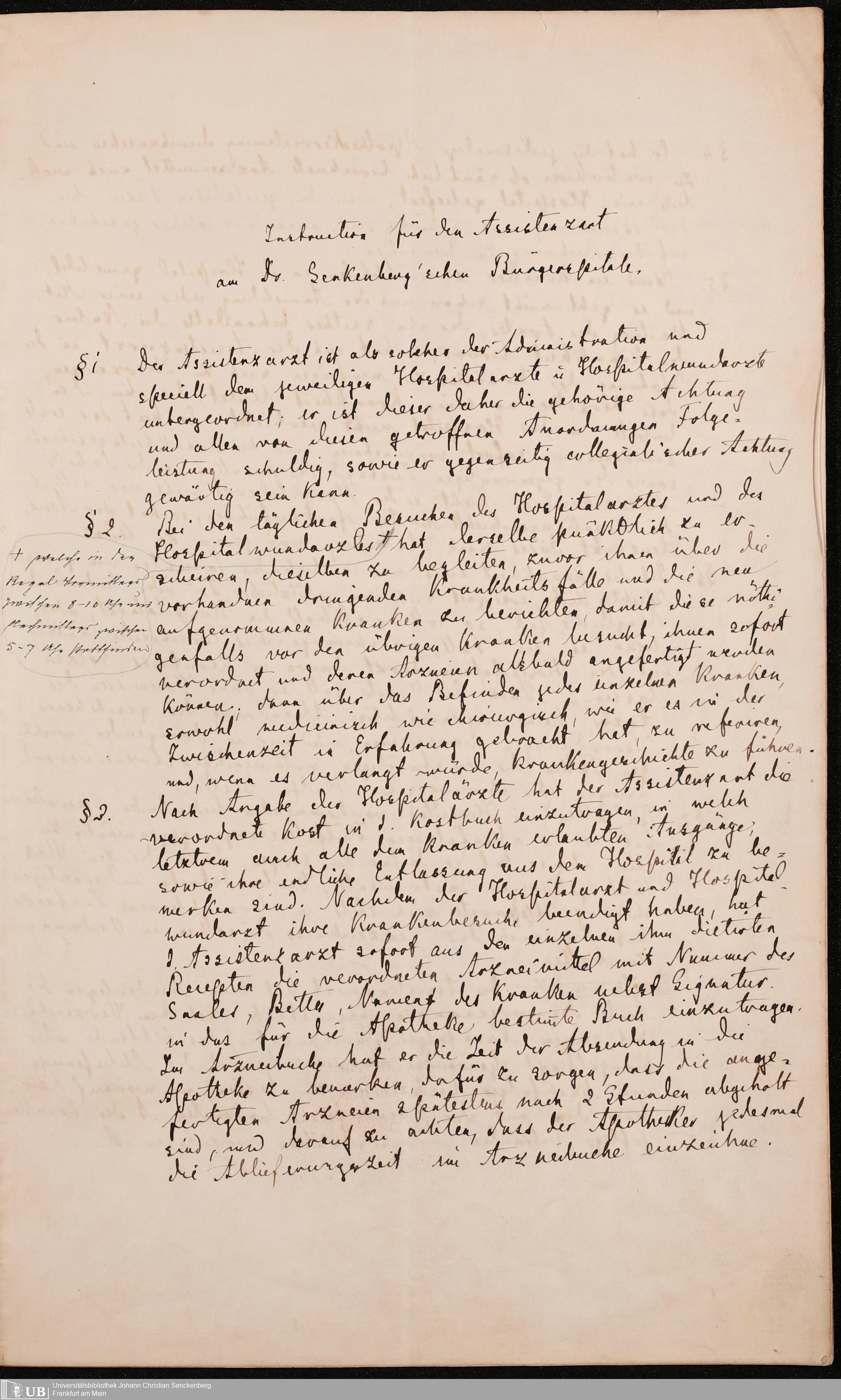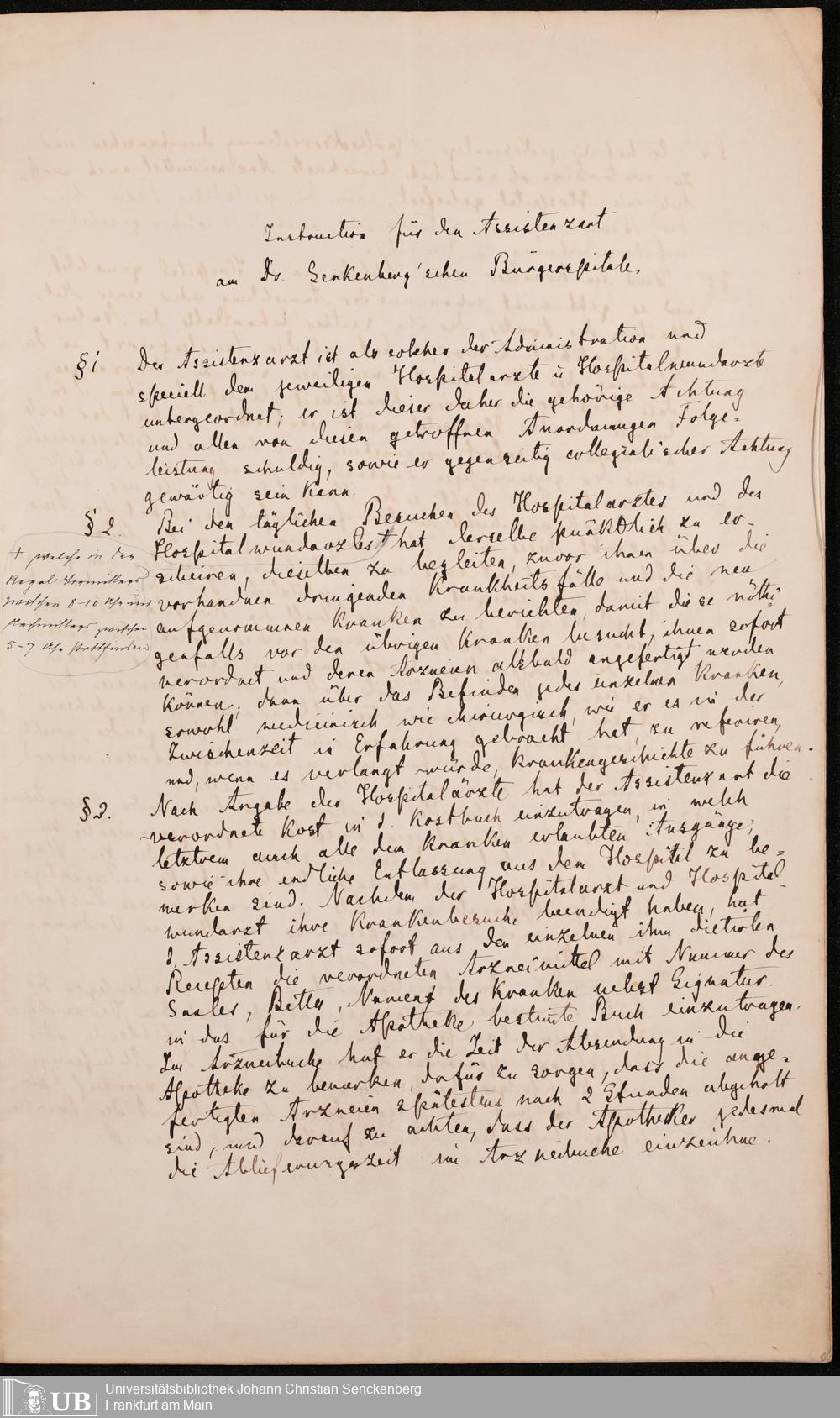 B 5 Dr. Senckenbergische Stiftung, 215 - Anstellungsregulativ und Instruktion für die Ärzte im Hospital