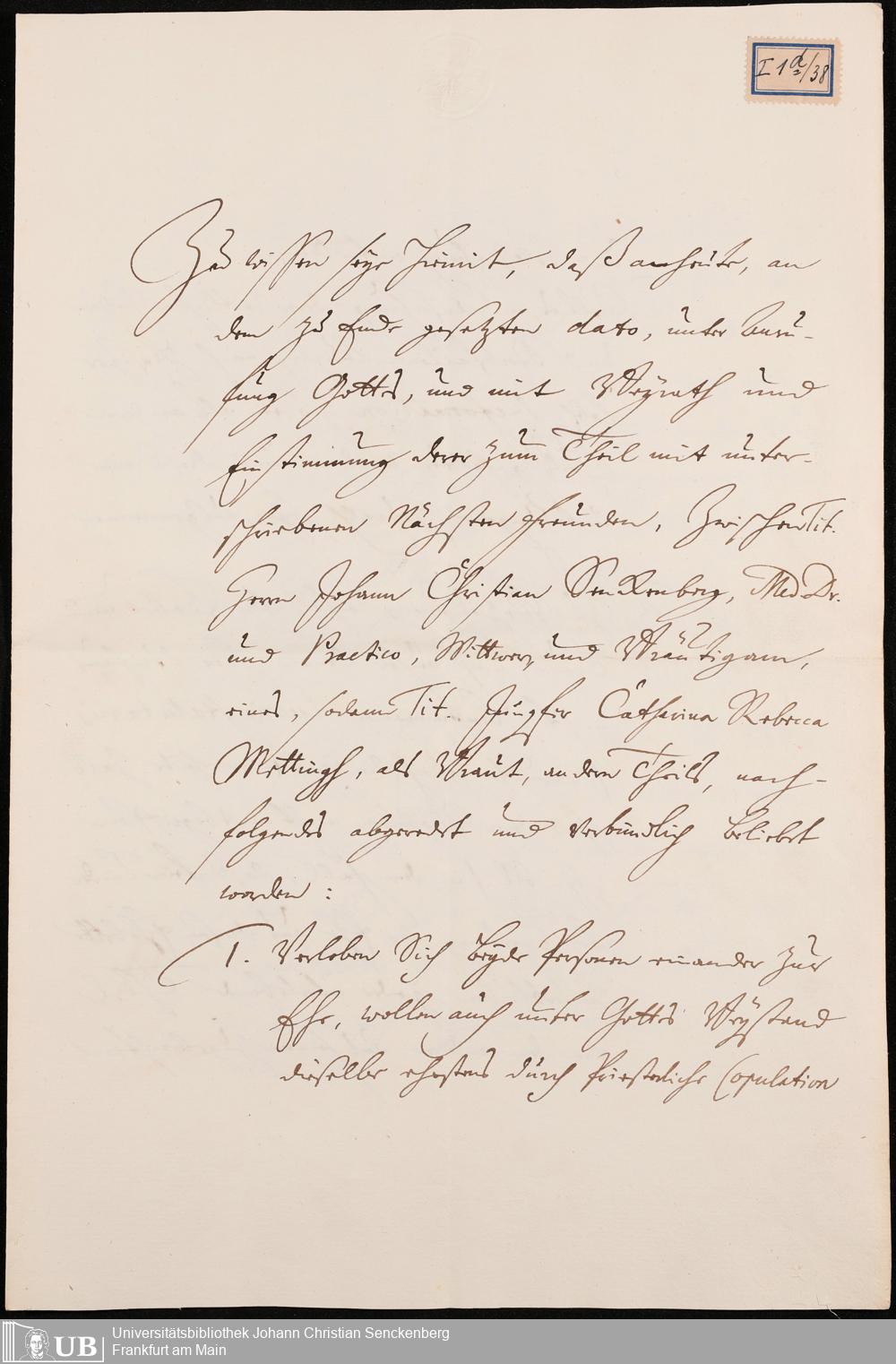 Na 31 Nachlass Johann Christian Senckenberg, 99 - Papiere über die zweite Eheschließung mit Katharina Rebecca Metthing