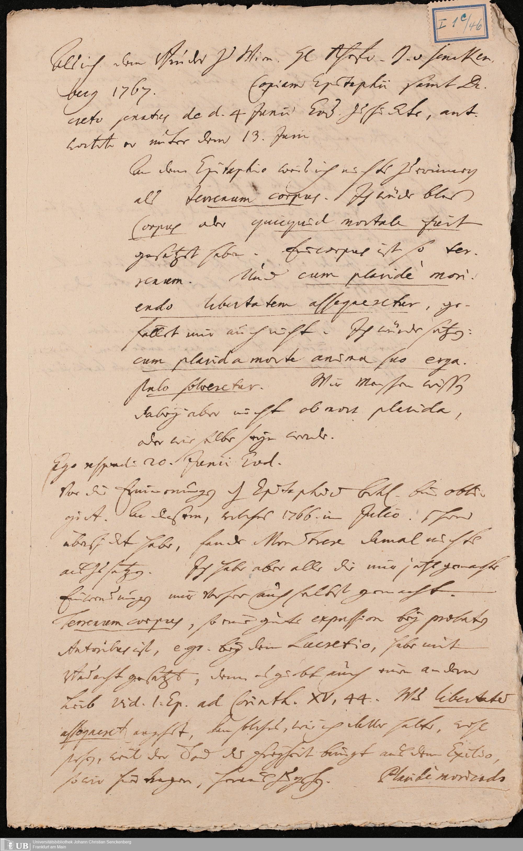 Na 31 Nachlass Johann Christian Senckenberg, 107 - Aufzeichnungen und Bestimmungen Senckenbergs zu seiner Grabstätte und deren Inschriften