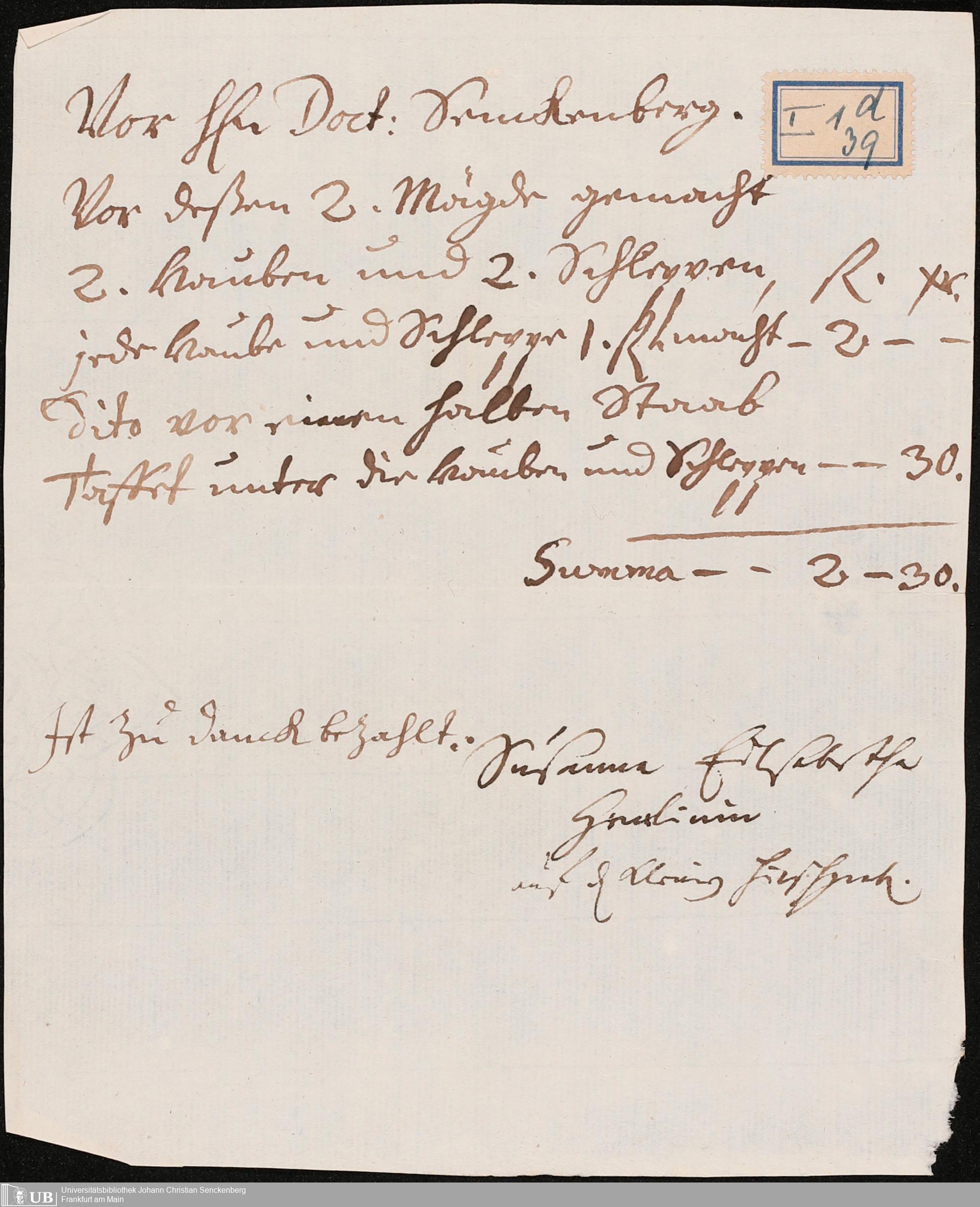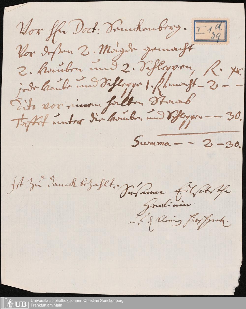 Na 31 Nachlass Johann Christian Senckenberg, 100 - Quittungen, Aufzeichnungen und Entwürfe zu den Beerdigungen der Ehefrauen Senckenbergs