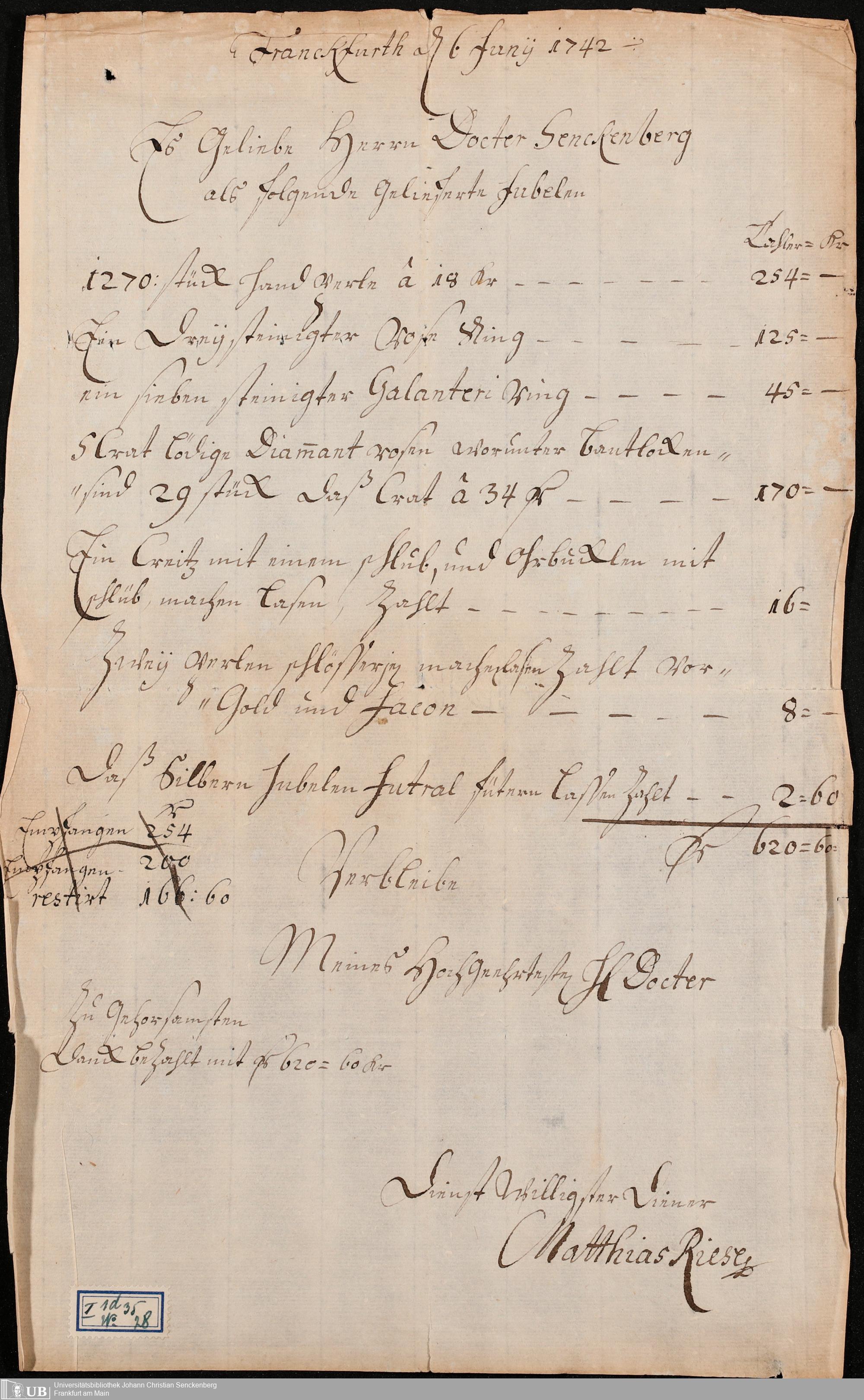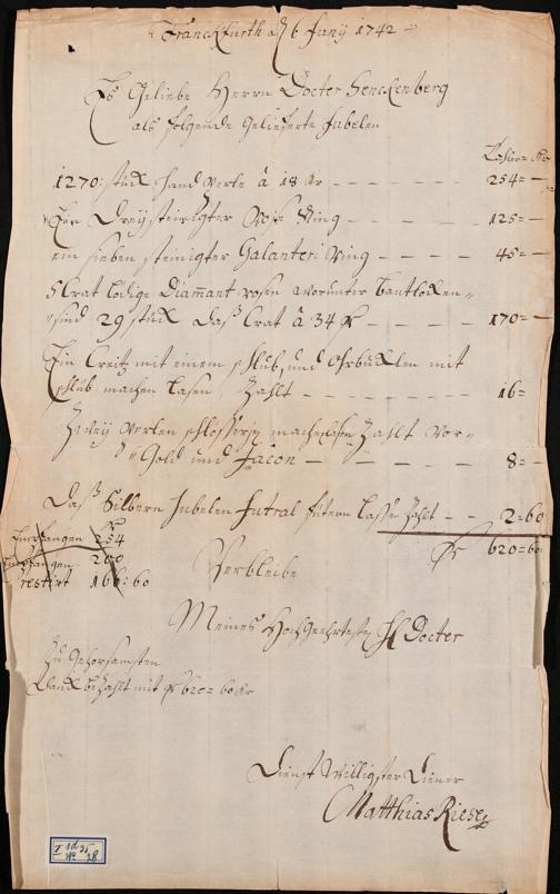 Na 31 Nachlass Johann Christian Senckenberg, 96 - Papiere über die erste Eheschließung mit Johanna Rebeca Riese