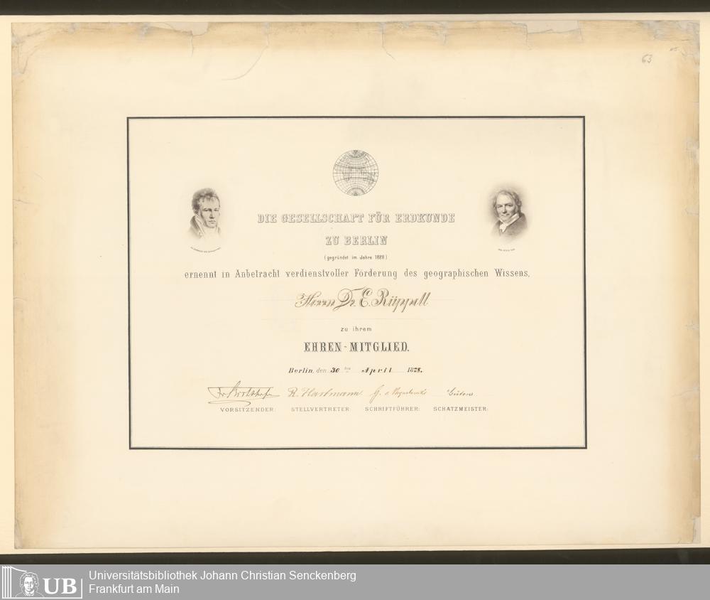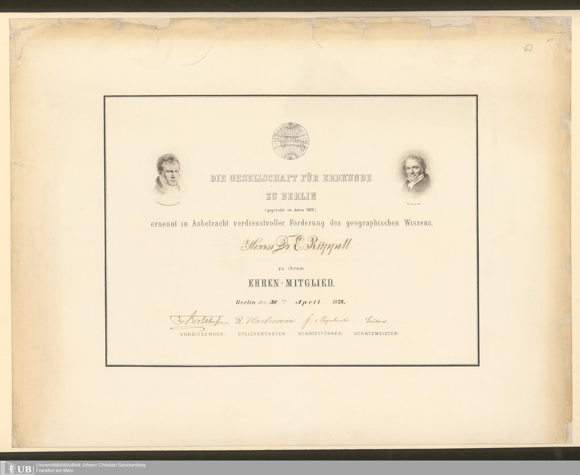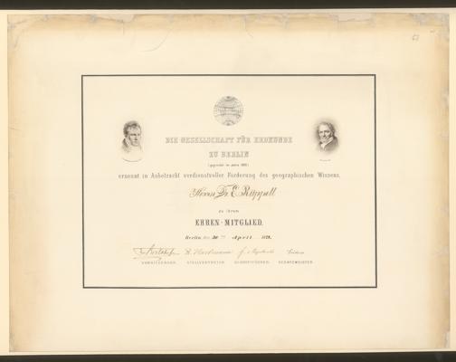 gr. 2˚ Hs 1 - Dr. Eduard Rüppell betreffende Diplome und Ehrenschreiben aus den Jahren 1818 - 1879. Nr. 1 - 64, nebst Verzeichnis