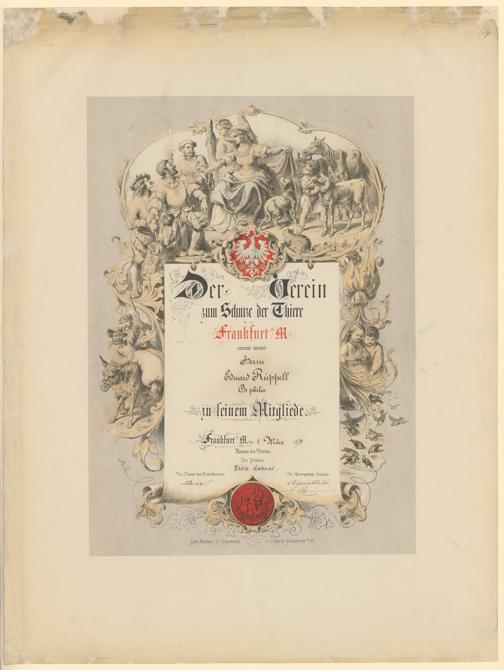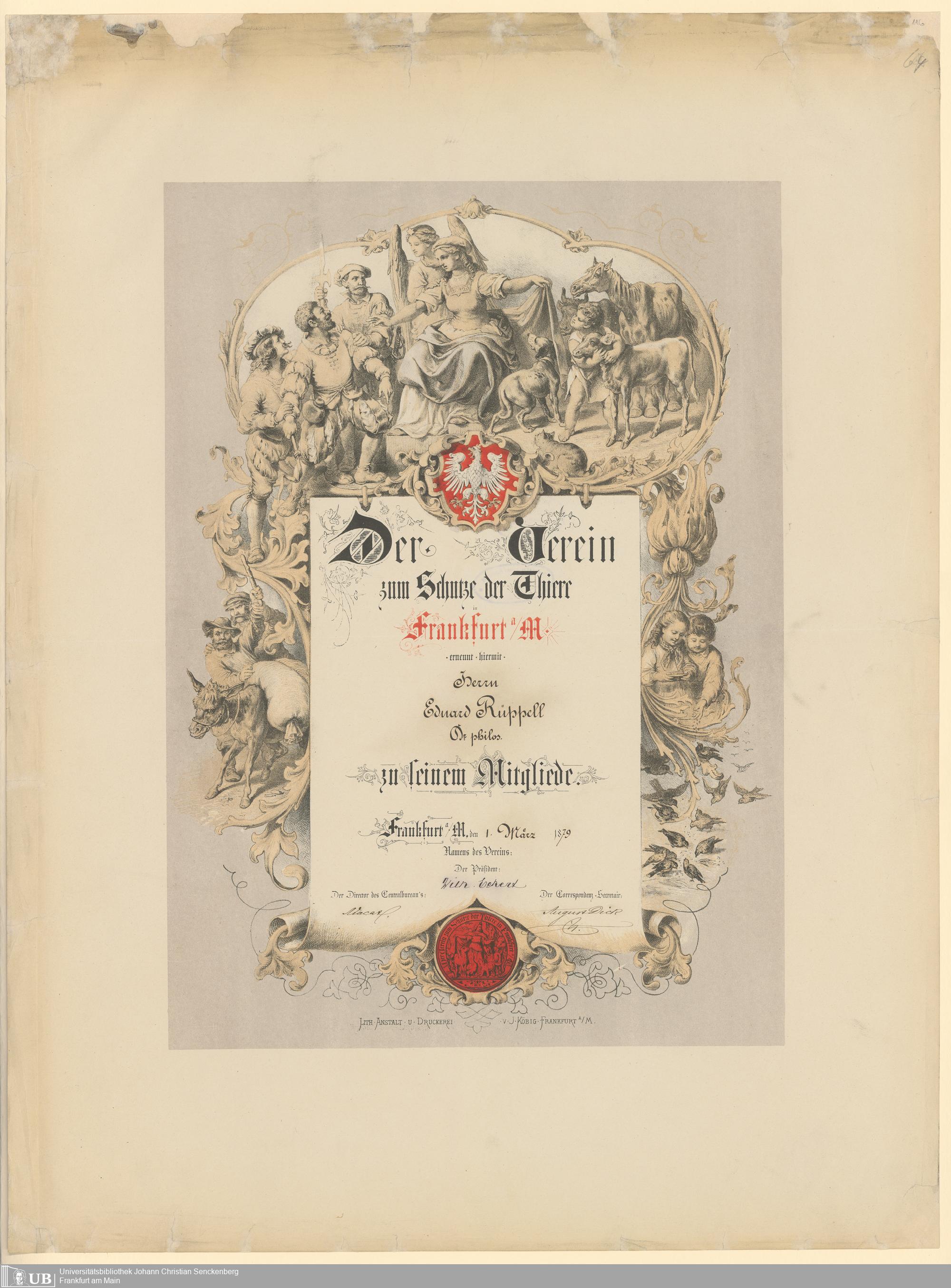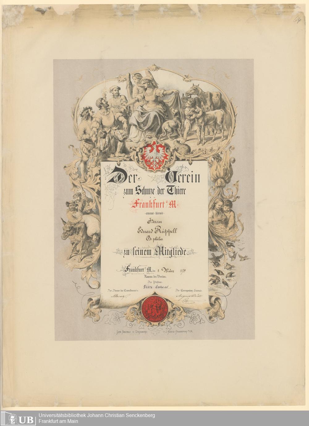 gr. 2˚ Hs 1 - Dr. Eduard Rüppell betreffende Diplome und Ehrenschreiben aus den Jahren 1818 - 1879. Nr. 1 - 64, nebst Verzeichnis
