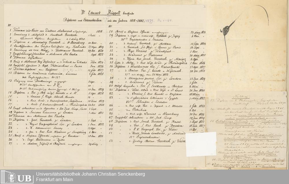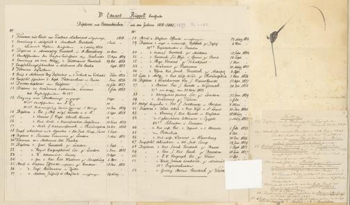 gr. 2˚ Hs 1 - Dr. Eduard Rüppell betreffende Diplome und Ehrenschreiben aus den Jahren 1818 - 1879. Nr. 1 - 64, nebst Verzeichnis