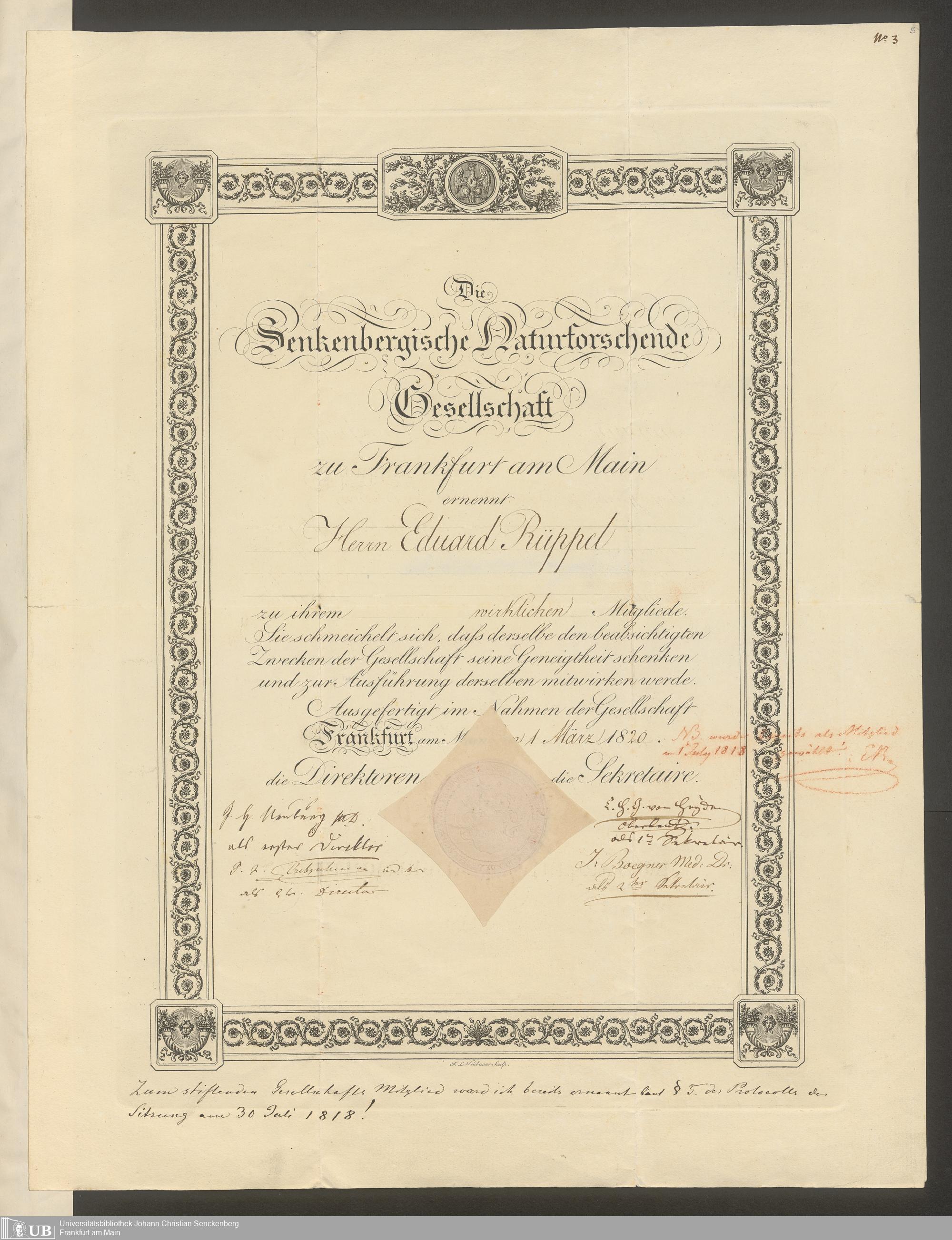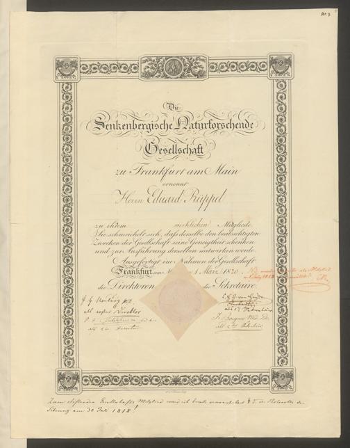gr. 2˚ Hs 1 - Dr. Eduard Rüppell betreffende Diplome und Ehrenschreiben aus den Jahren 1818 - 1879. Nr. 1 - 64, nebst Verzeichnis
